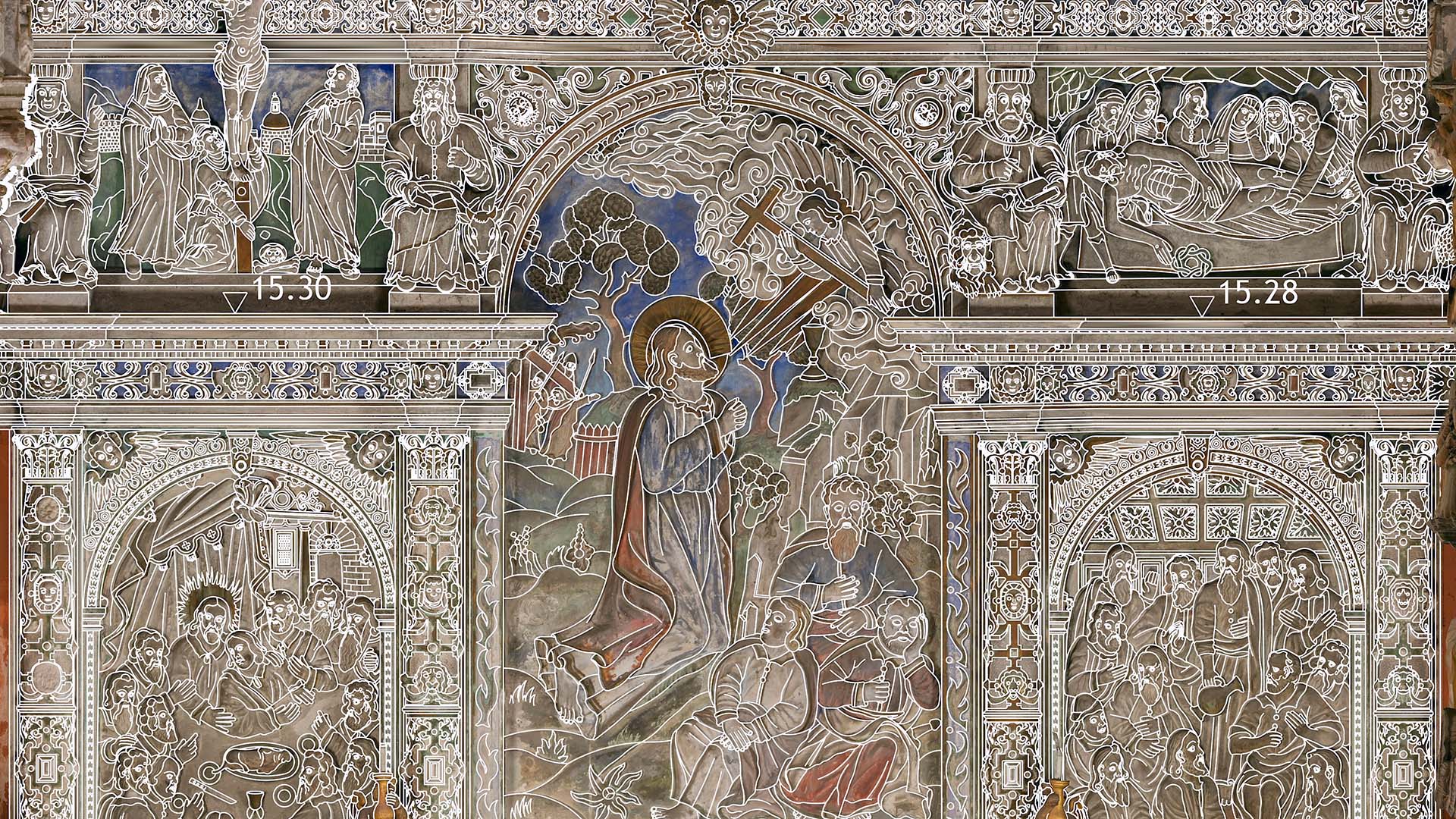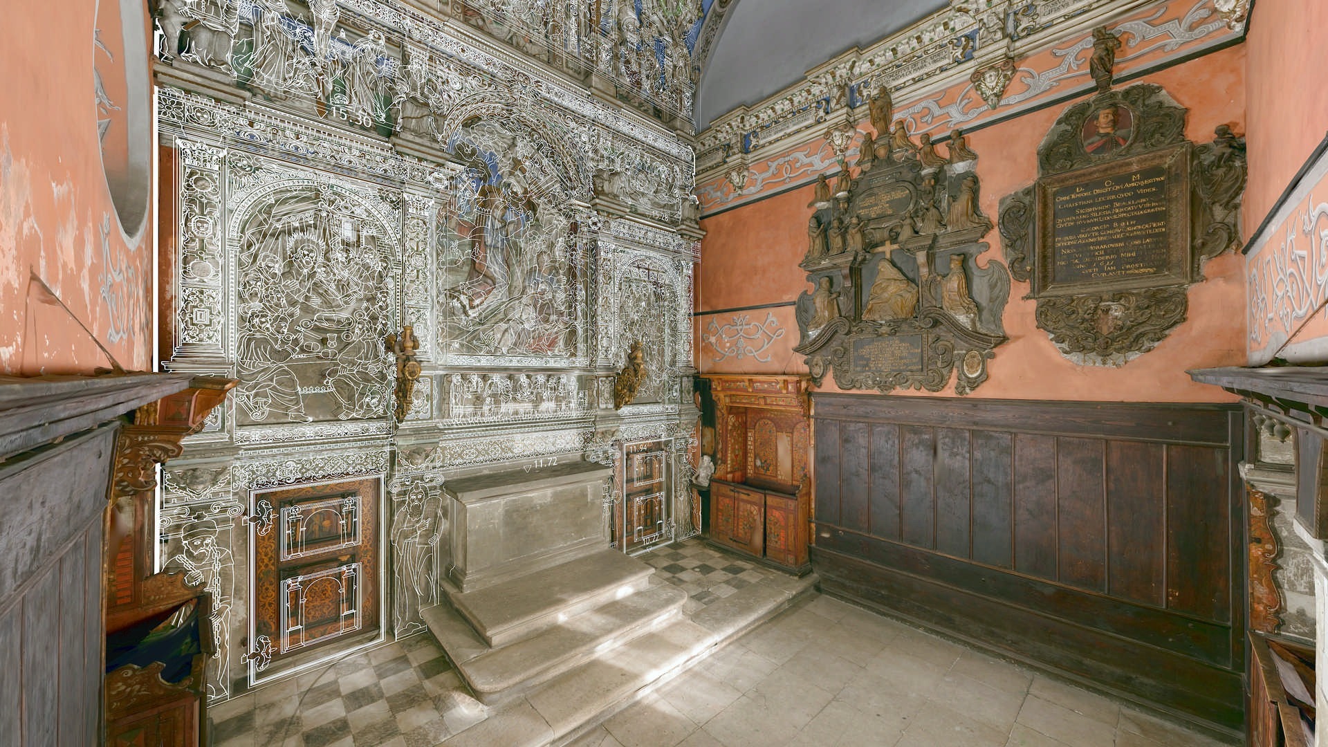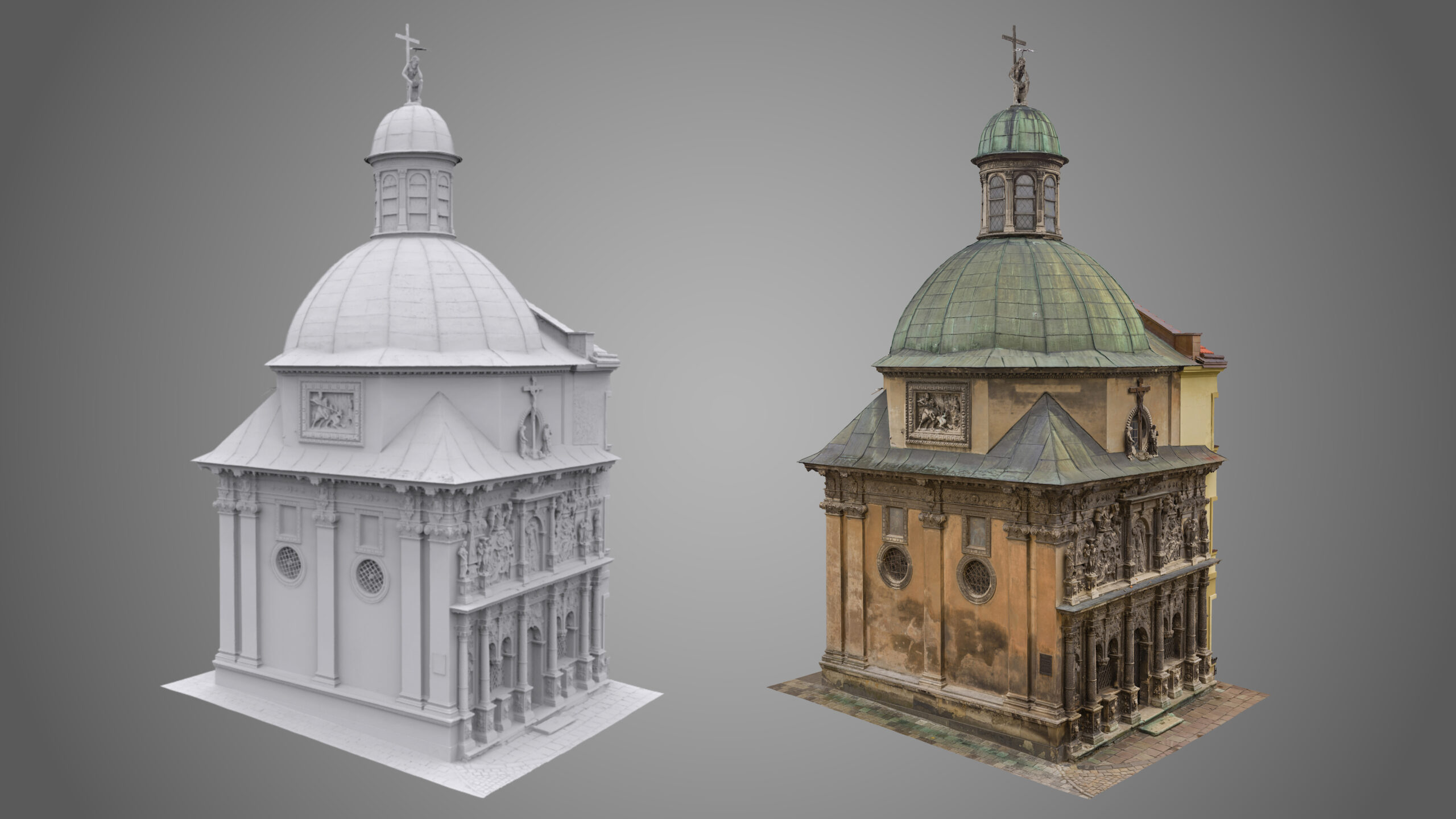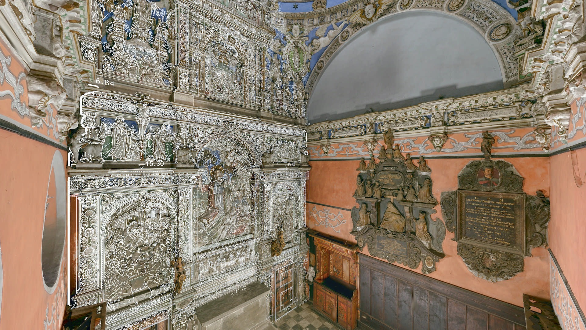 Під час зйомки, окрім звичайного лазерного сканування, ми використовували дрон і камеру, встановлену на стовпі. Крім того, ми встановили в каплиці спеціальні будівельні риштування, щоб зафіксувати всі деталі її інтер’єру. Завдяки цьому нам вдалося отримати точні дані лазерного сканування та фотографії. Згодом ми обробили ці вхідні дані, що призвело до створення фотограмметричної документації каплиці, а також детальної 2D-документації CAD і високополігональної сітчастої 3D-моделі.