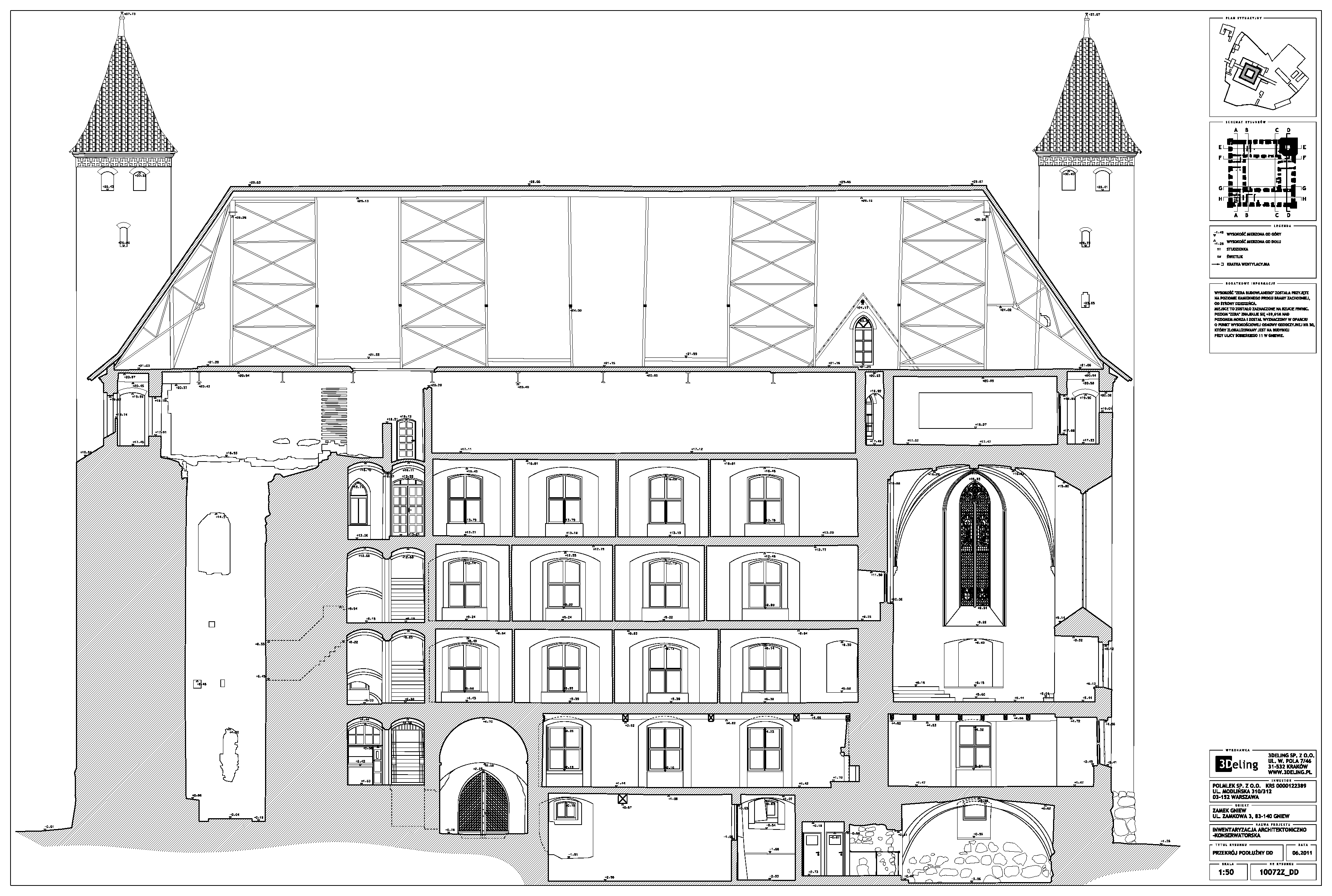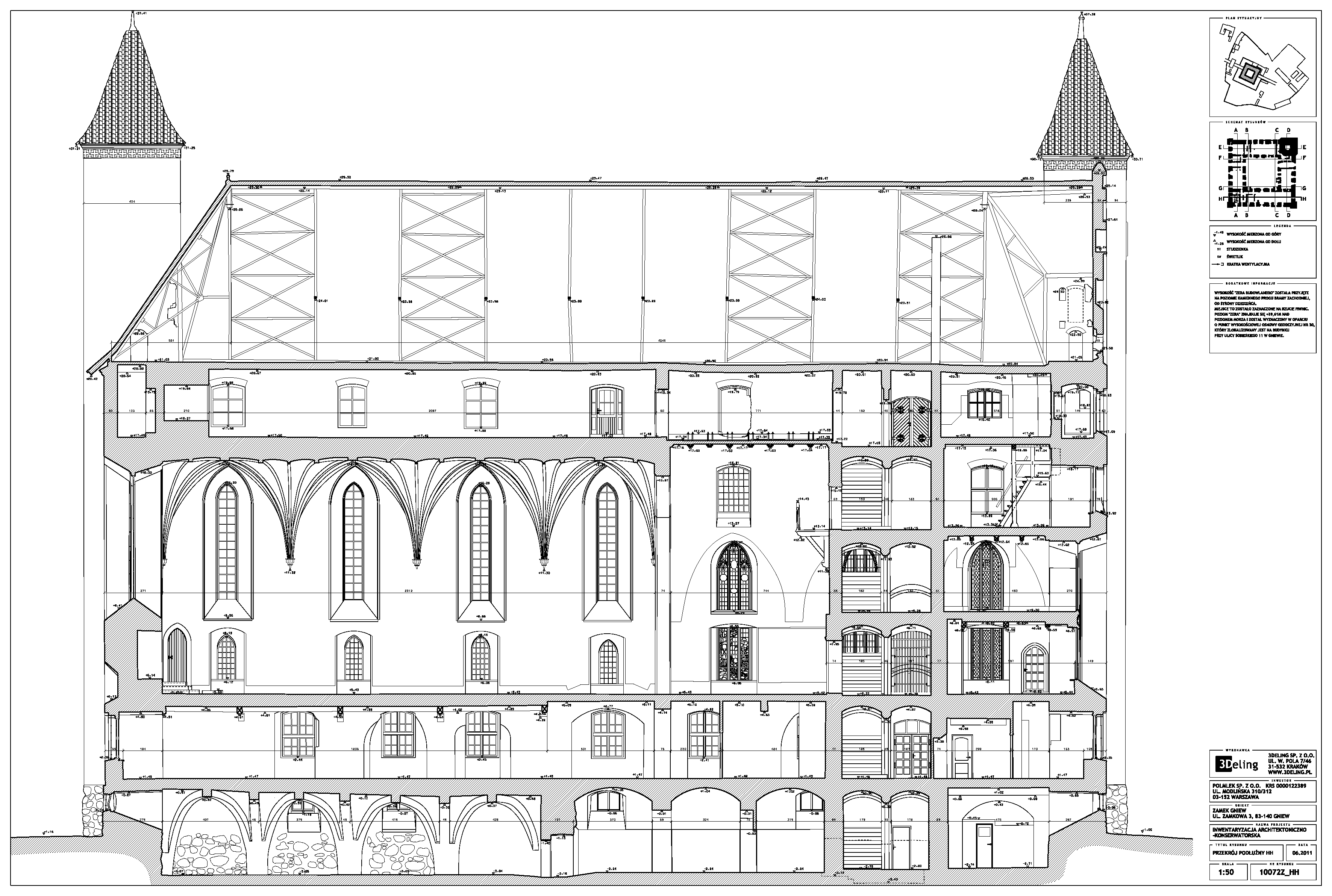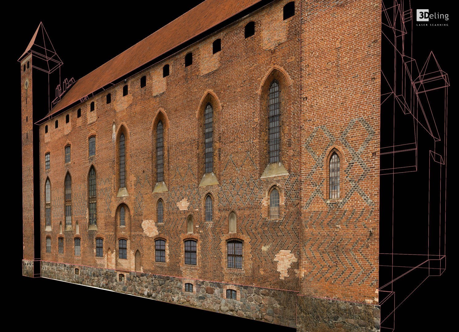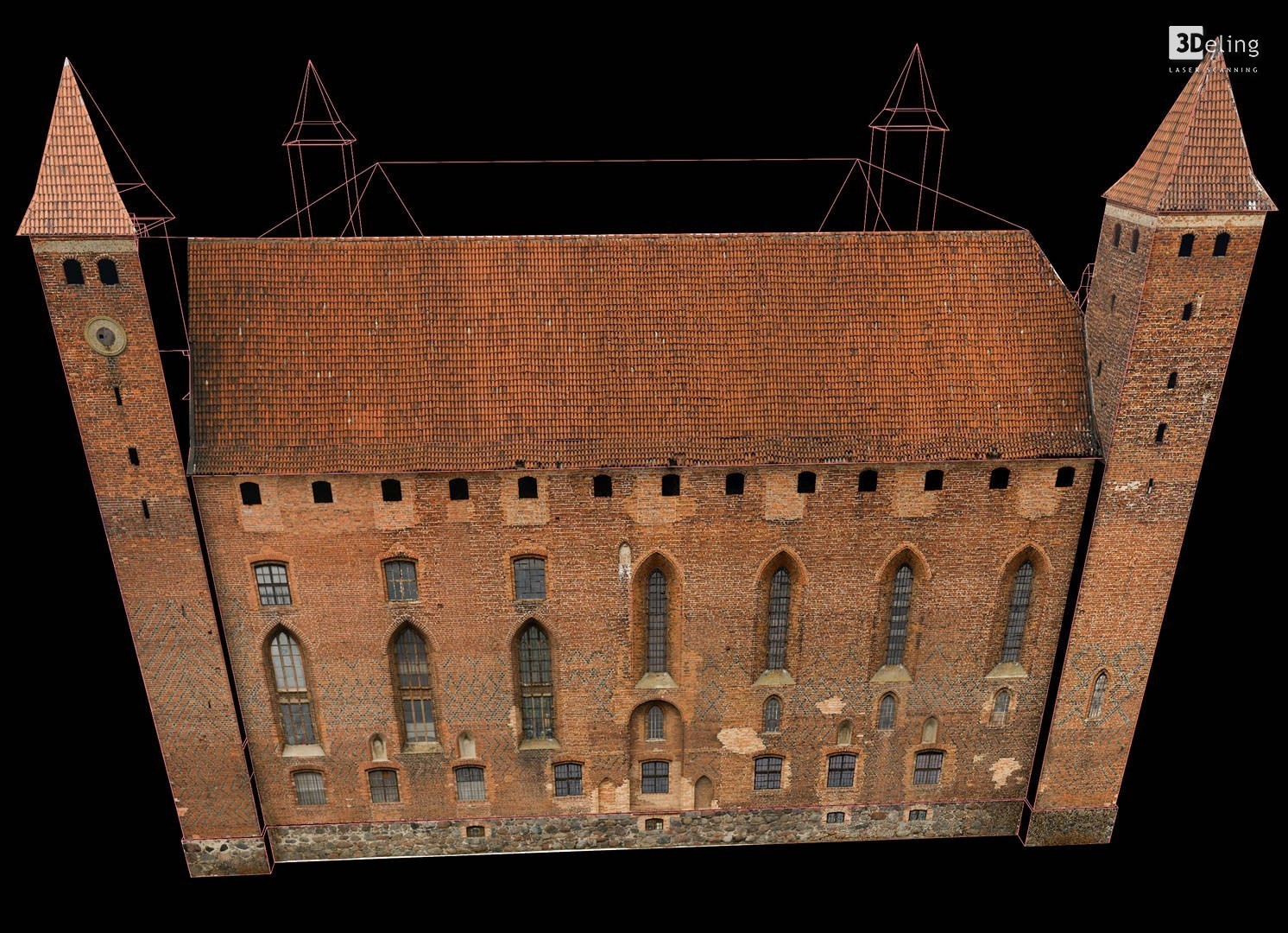 На початку 2011 року компанія 3Deling отримала контракт на проведення лазерного сканування середньовічного замку в місті Гнев, Польща. Об’єкт просканували повністю, включно з підвалом і горищем. Окремі скани (всього близько 800 позицій сканера) були об’єднані в одну систему координат. Згодом хмара точок була використана для створення повного 2D-набору даних для замку, у тому числі плани поверхів, розрізи та креслення фасадів.