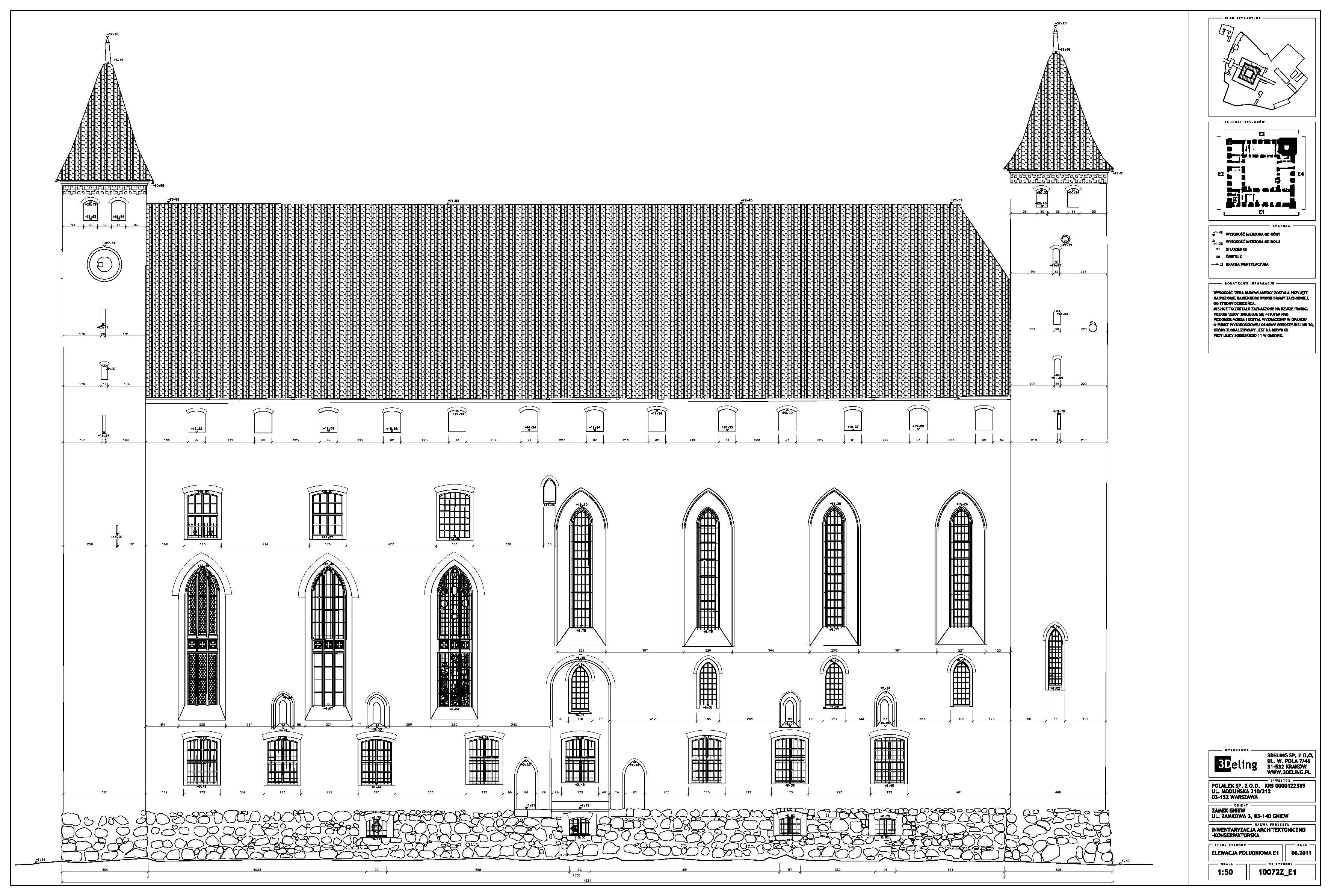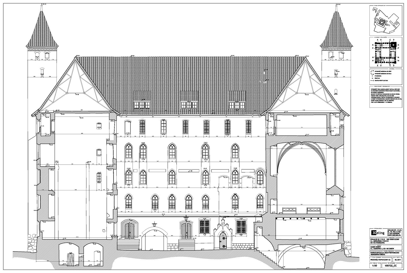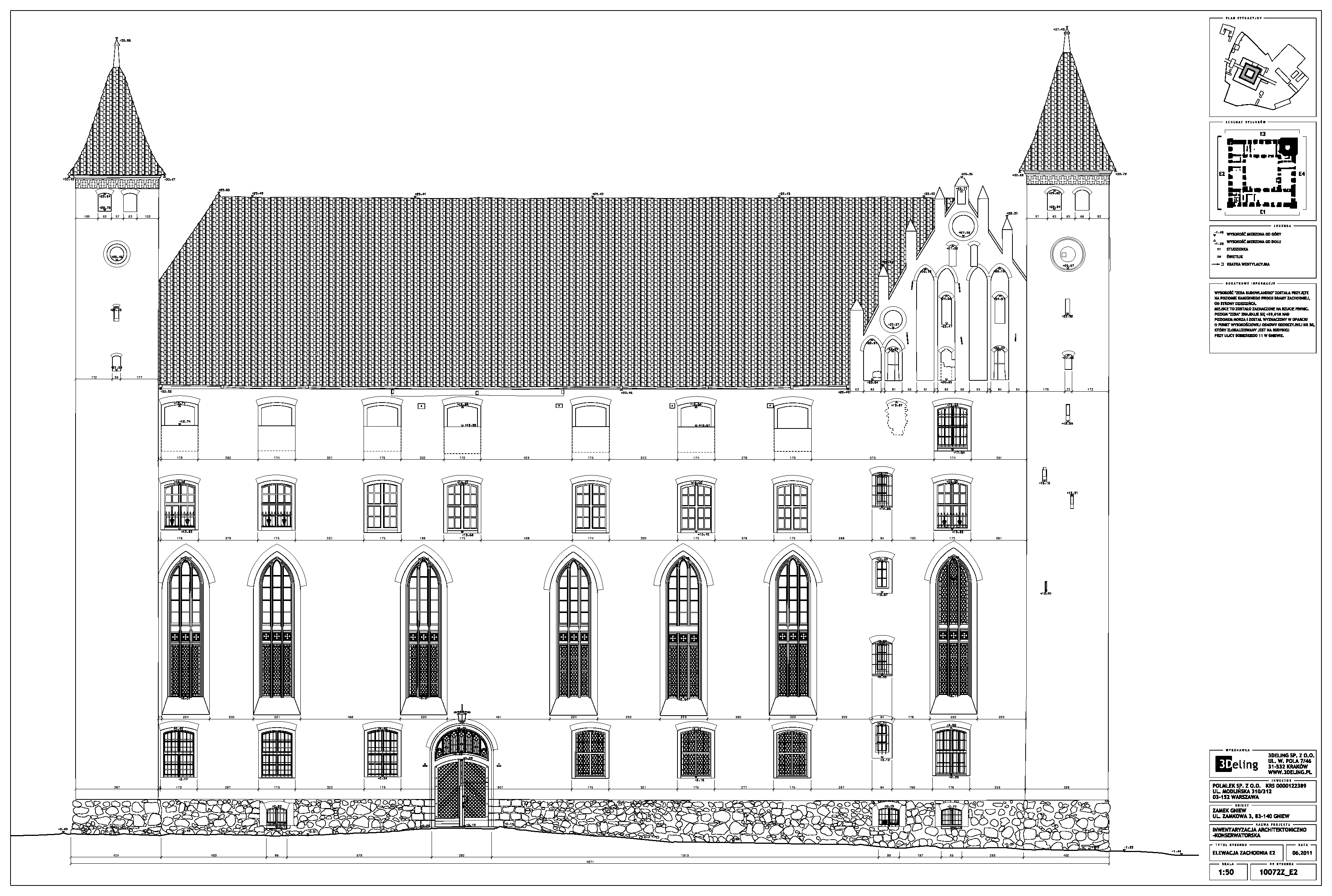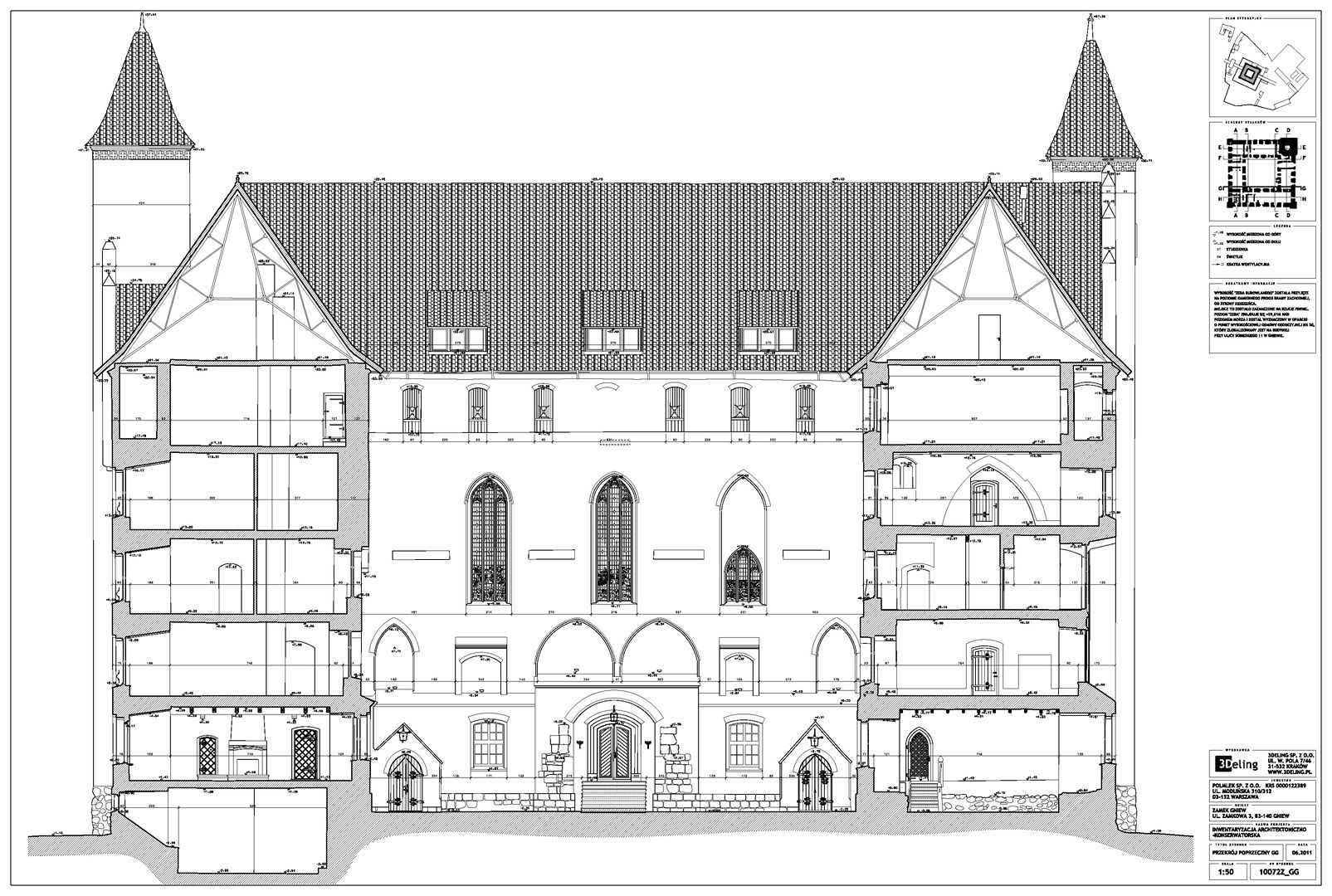 На початку 2011 року компанія 3Deling отримала контракт на проведення лазерного сканування середньовічного замку в місті Гнев, Польща. Об’єкт просканували повністю, включно з підвалом і горищем. Окремі скани (всього близько 800 позицій сканера) були об’єднані в одну систему координат. Згодом хмара точок була використана для створення повного 2D-набору даних для замку, у тому числі плани поверхів, розрізи та креслення фасадів.