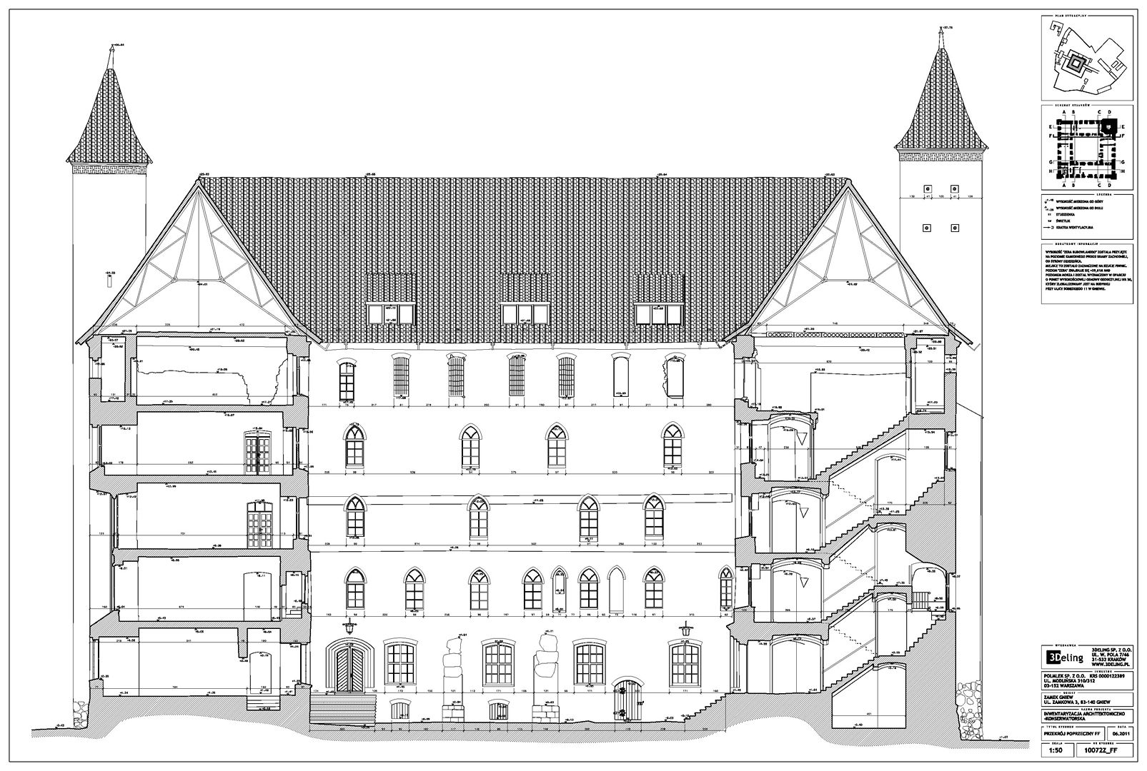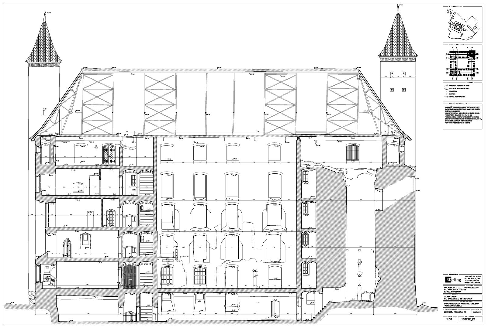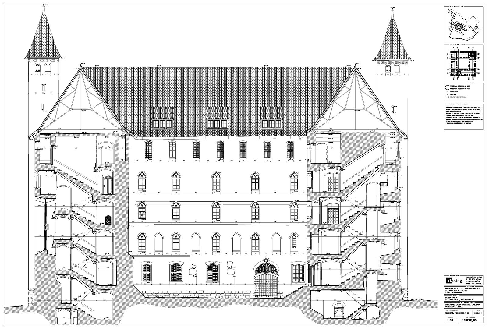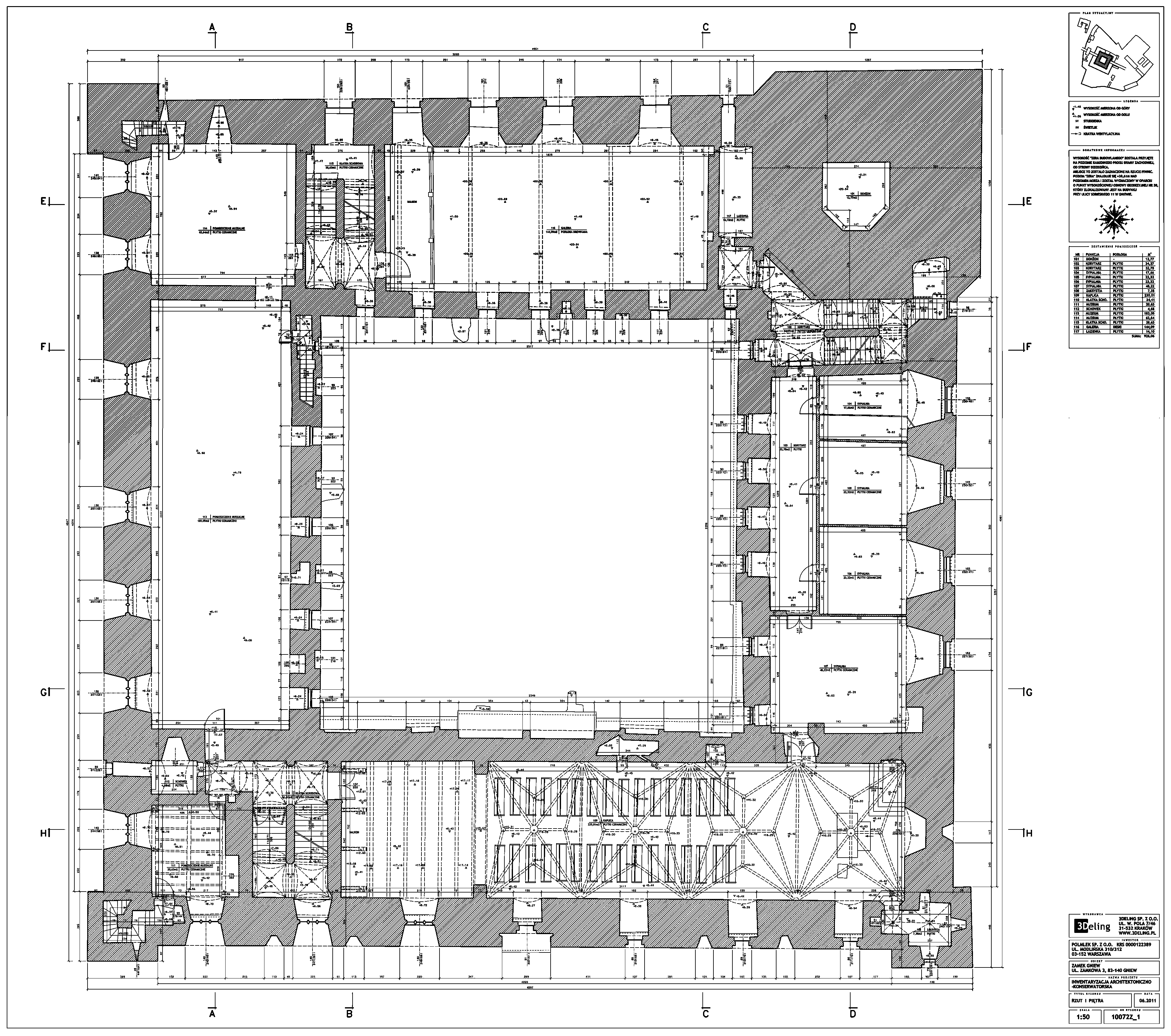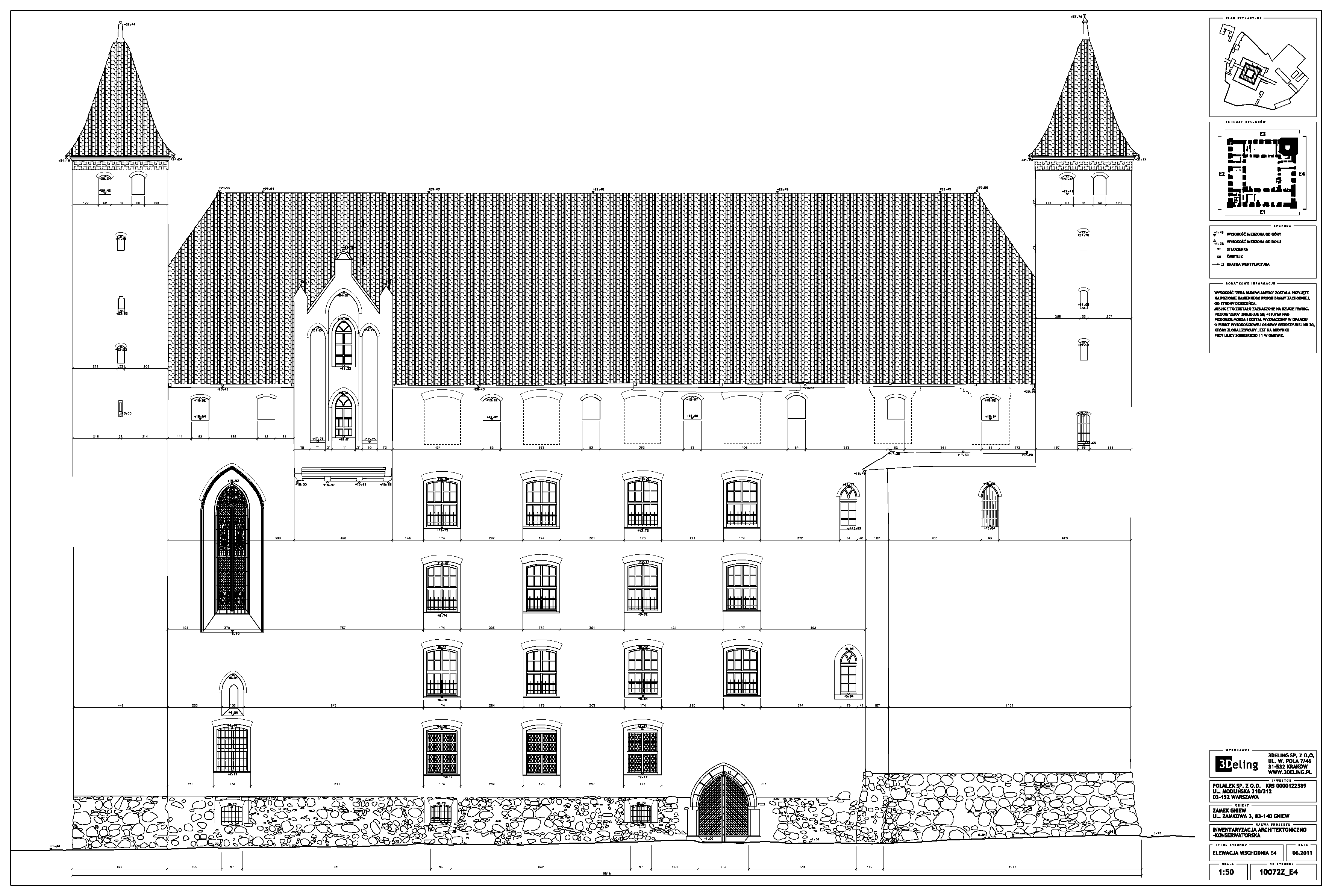 На початку 2011 року компанія 3Deling отримала контракт на проведення лазерного сканування середньовічного замку в місті Гнев, Польща. Об’єкт просканували повністю, включно з підвалом і горищем. Окремі скани (всього близько 800 позицій сканера) були об’єднані в одну систему координат. Згодом хмара точок була використана для створення повного 2D-набору даних для замку, у тому числі плани поверхів, розрізи та креслення фасадів.