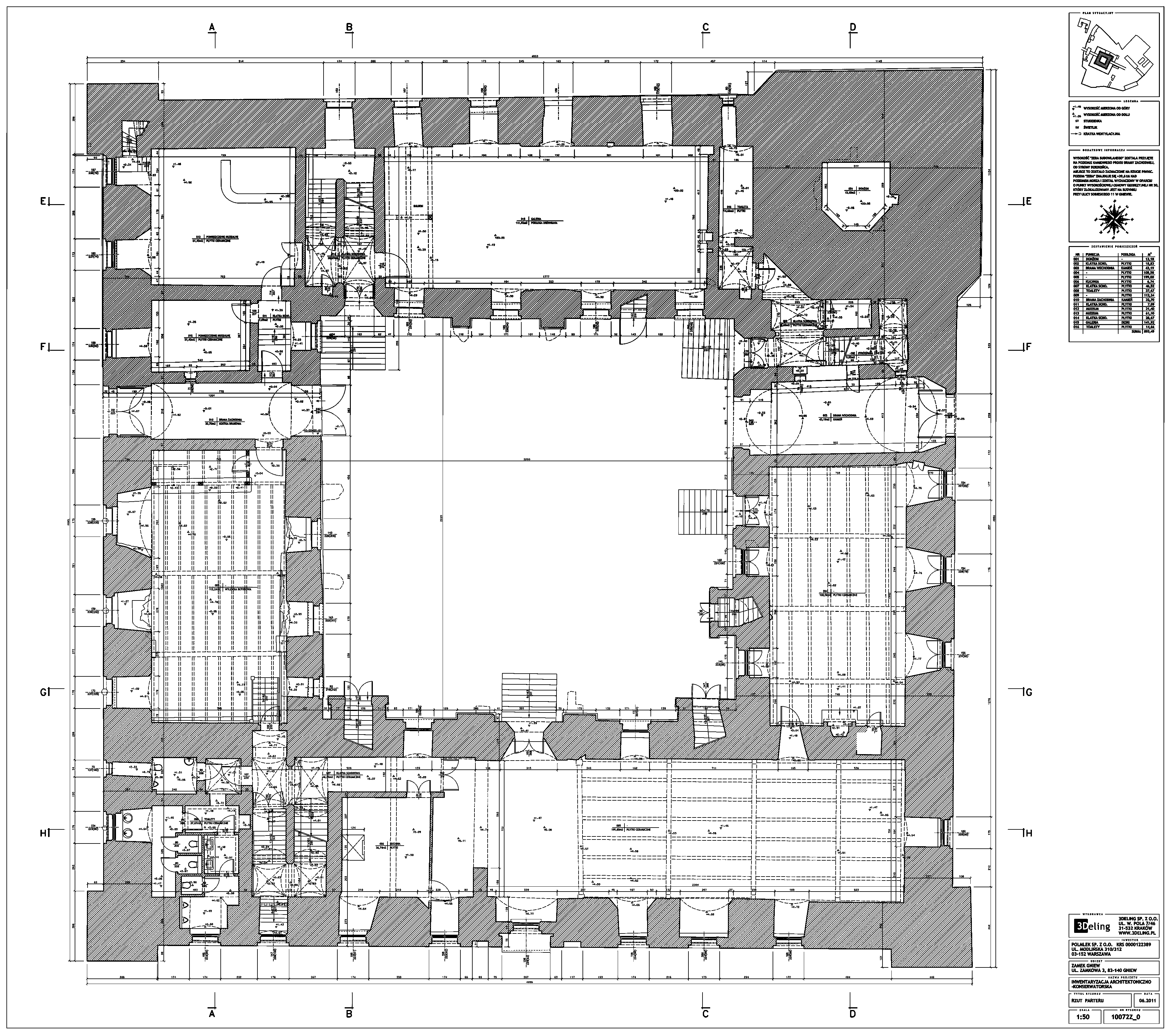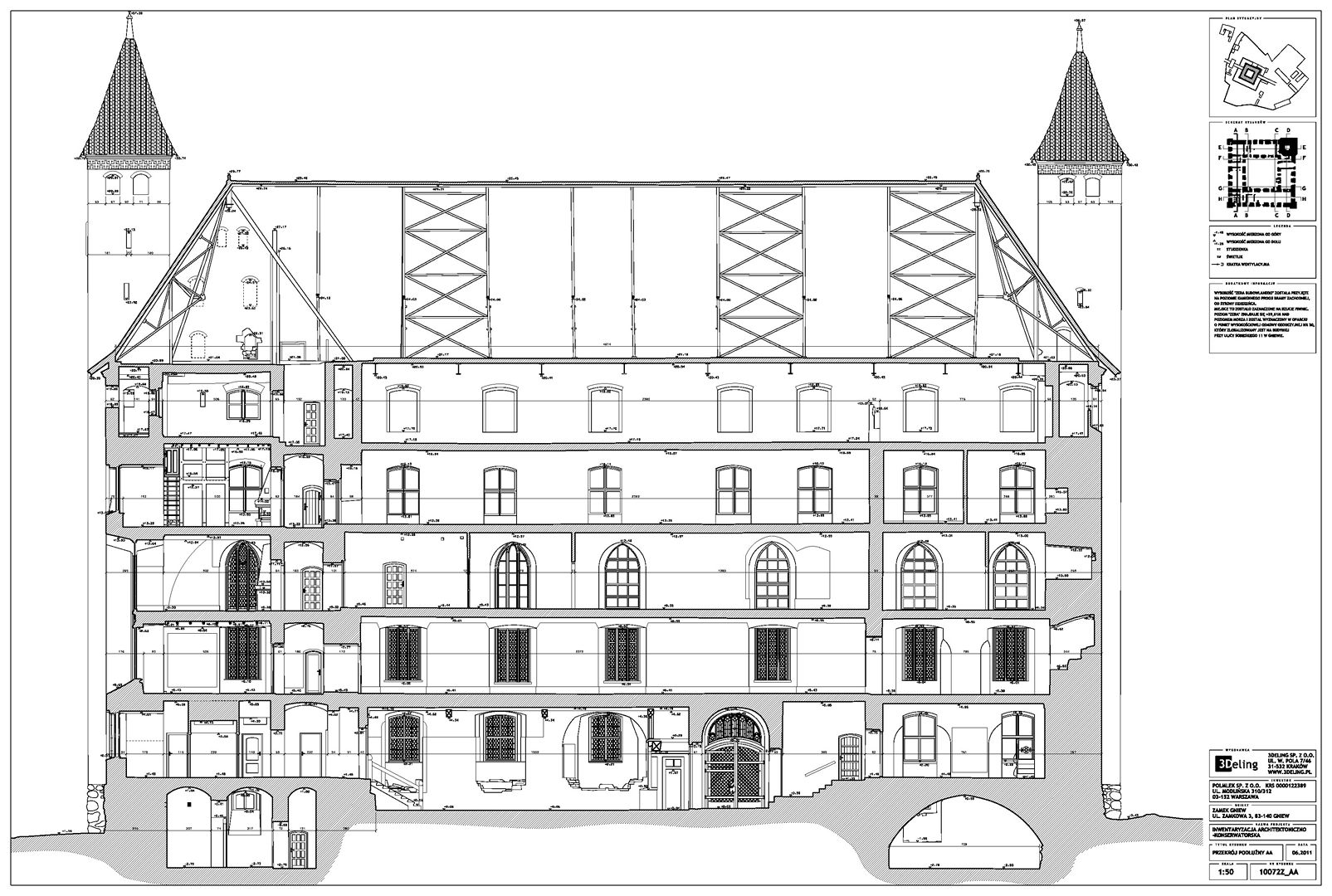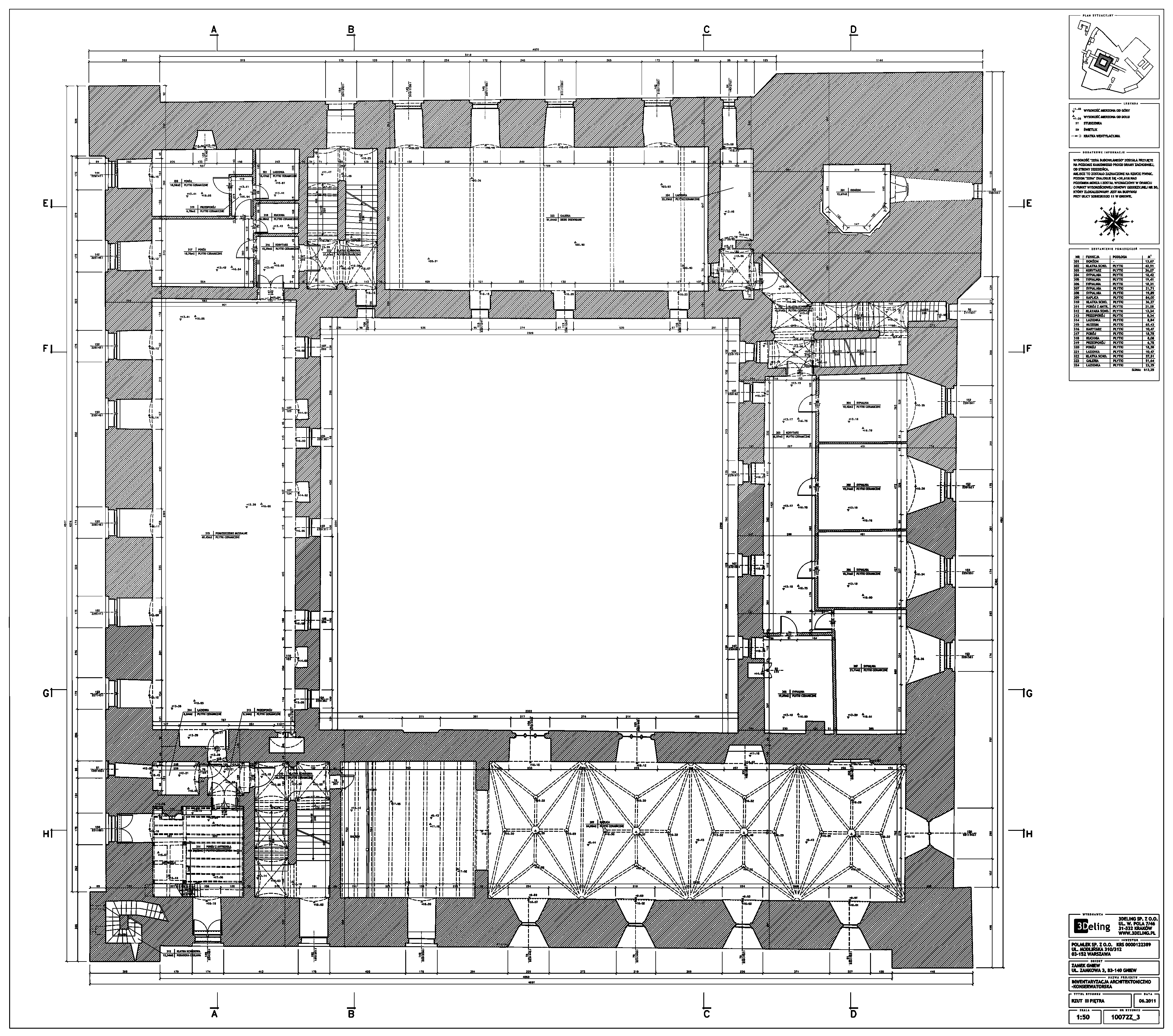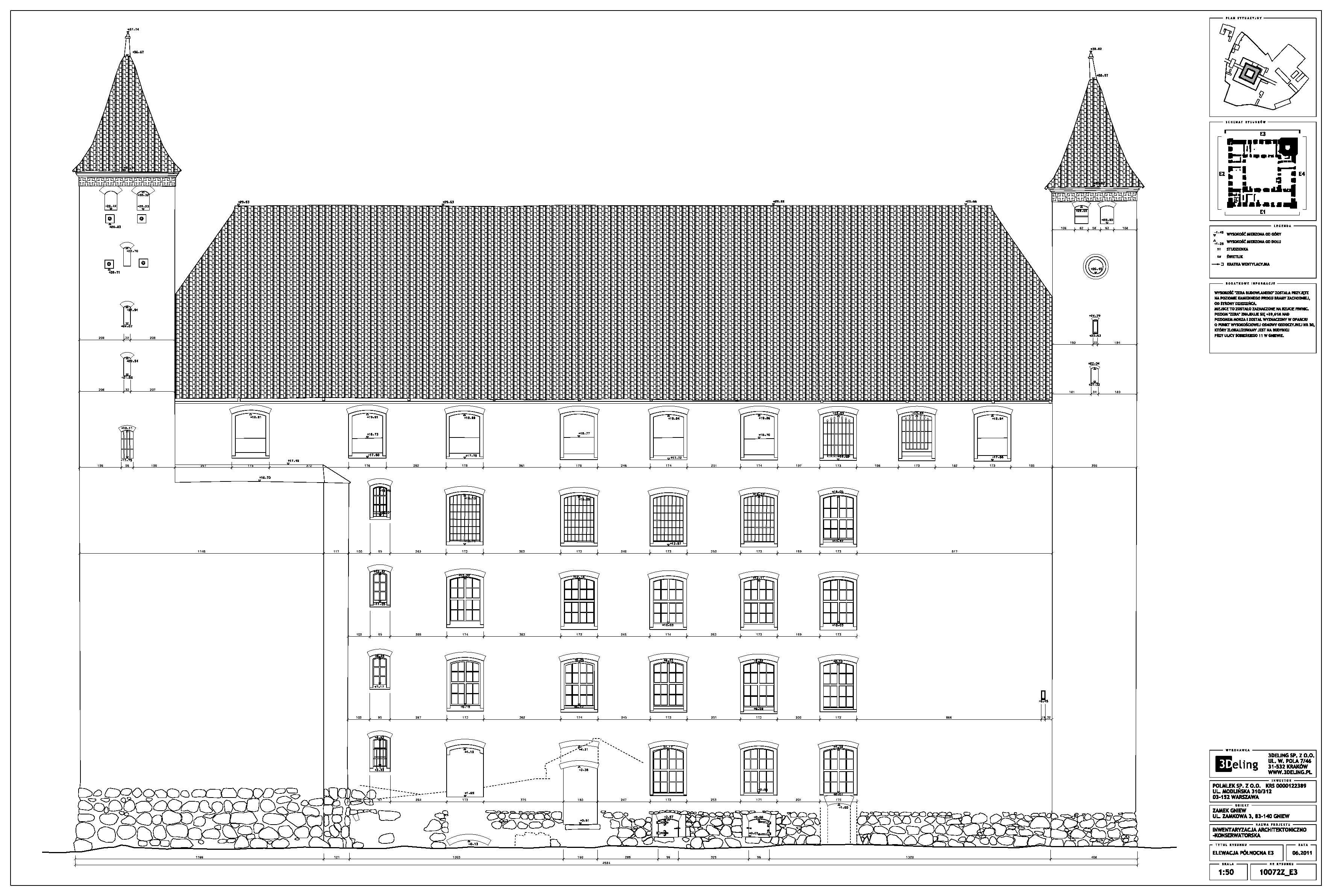 На початку 2011 року компанія 3Deling отримала контракт на проведення лазерного сканування середньовічного замку в місті Гнев, Польща. Об’єкт просканували повністю, включно з підвалом і горищем. Окремі скани (всього близько 800 позицій сканера) були об’єднані в одну систему координат. Згодом хмара точок була використана для створення повного 2D-набору даних для замку, у тому числі плани поверхів, розрізи та креслення фасадів.
