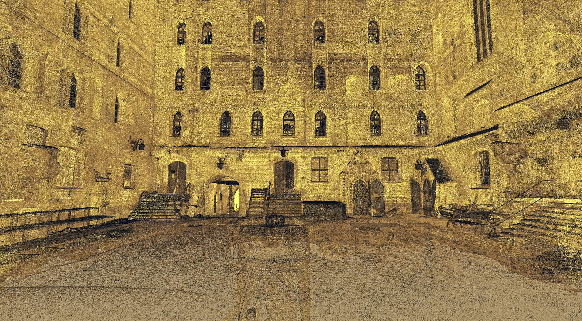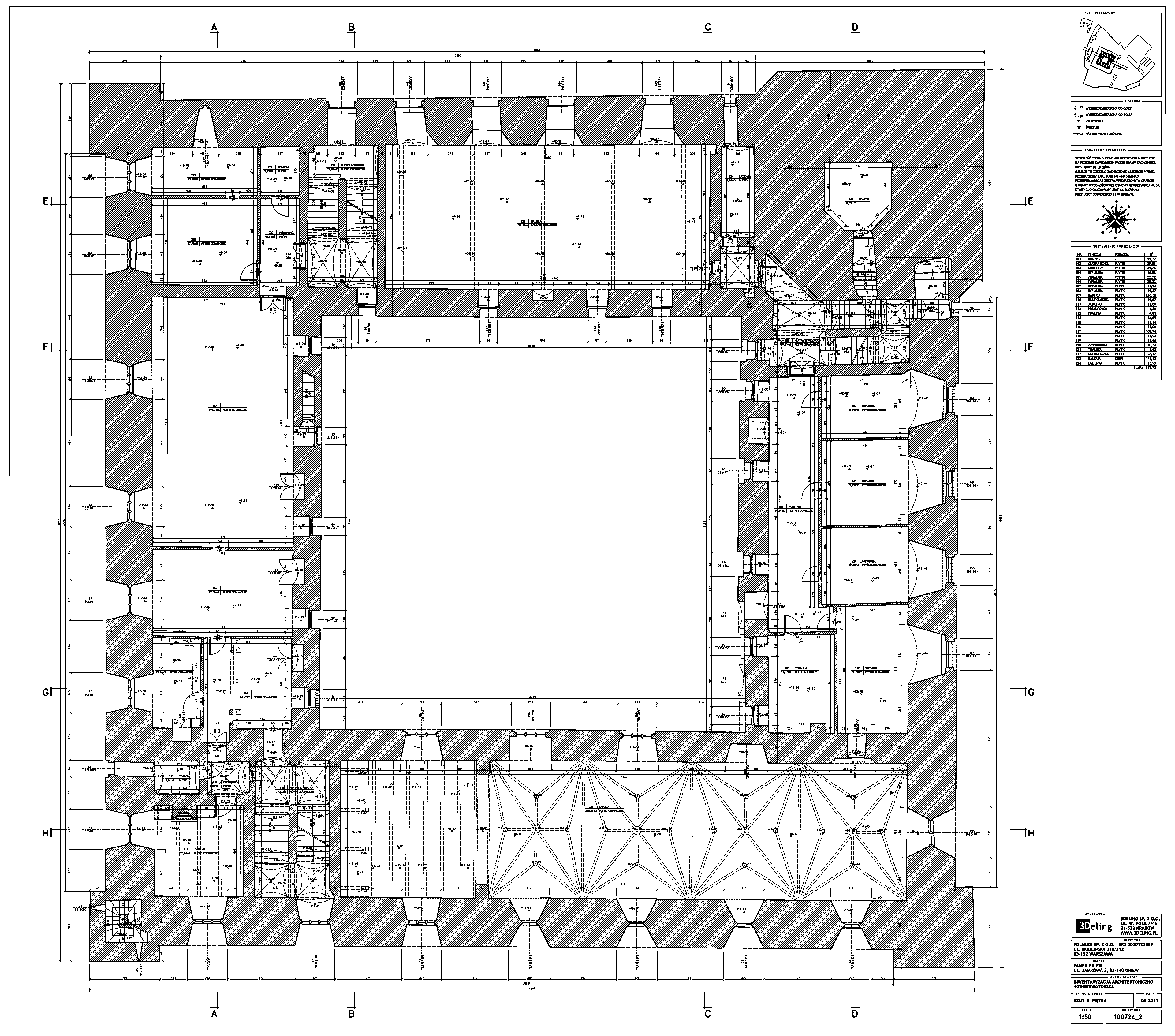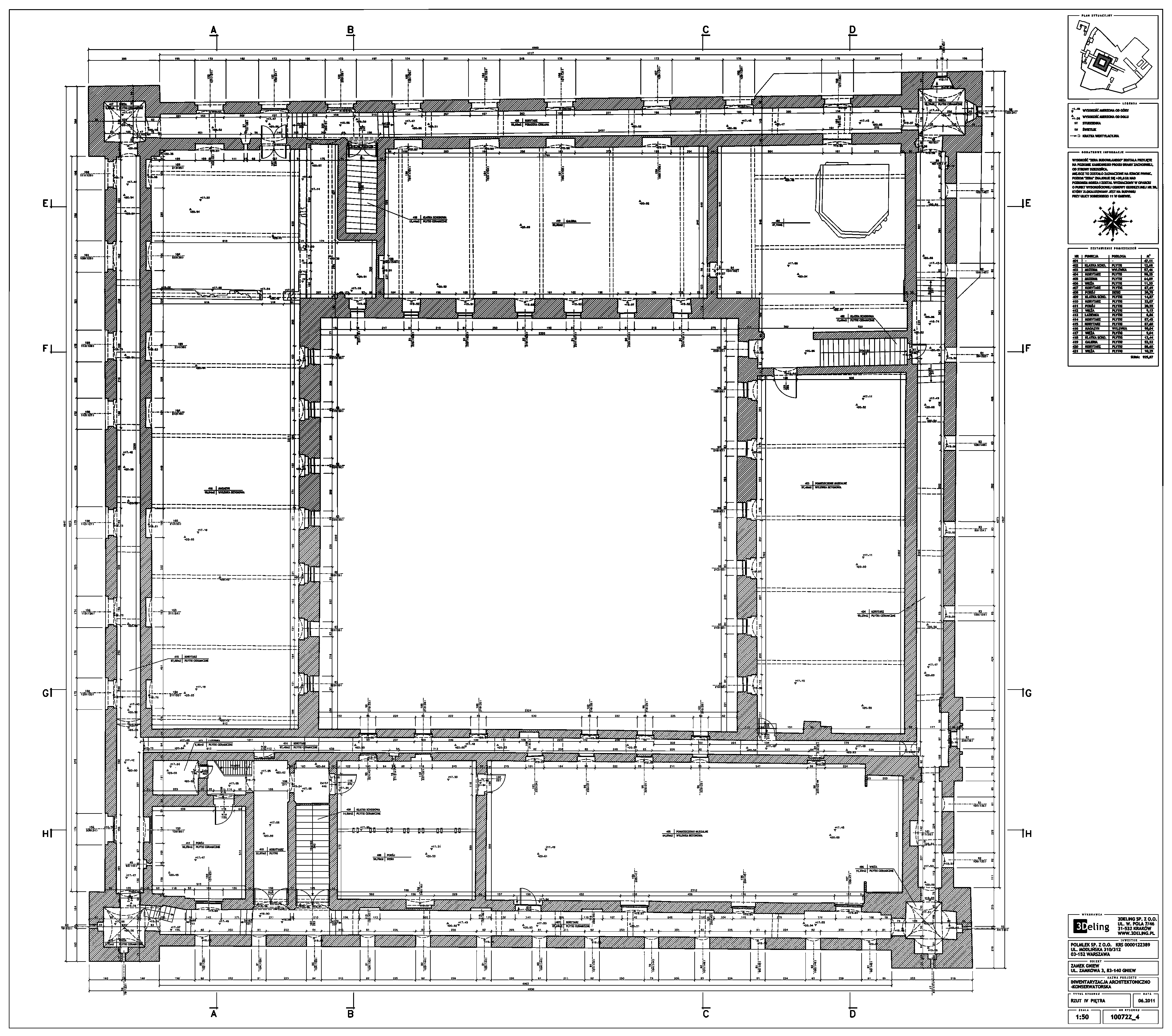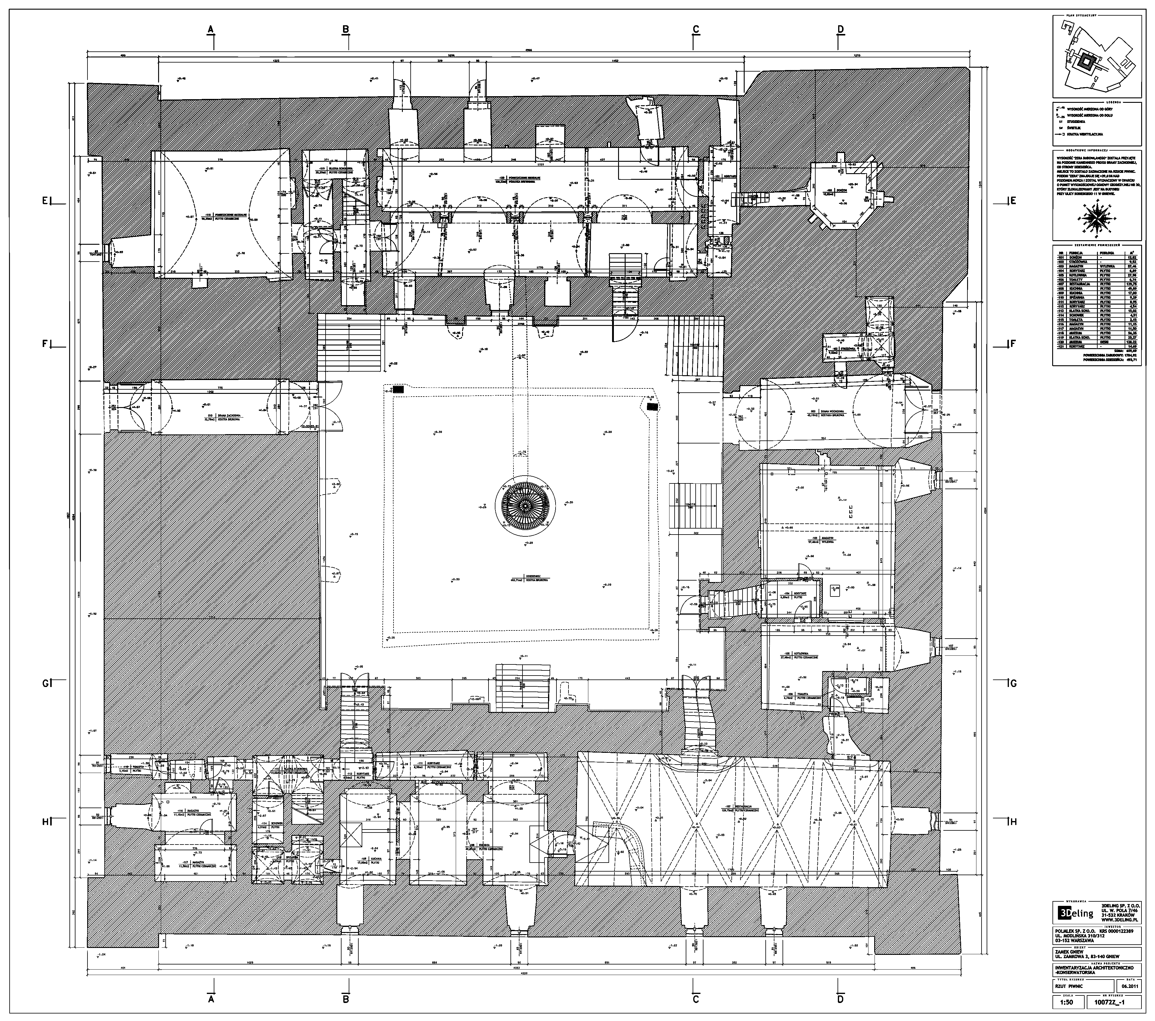 На початку 2011 року компанія 3Deling отримала контракт на проведення лазерного сканування середньовічного замку в місті Гнев, Польща. Об’єкт просканували повністю, включно з підвалом і горищем. Окремі скани (всього близько 800 позицій сканера) були об’єднані в одну систему координат. Згодом хмара точок була використана для створення повного 2D-набору даних для замку, у тому числі плани поверхів, розрізи та креслення фасадів.