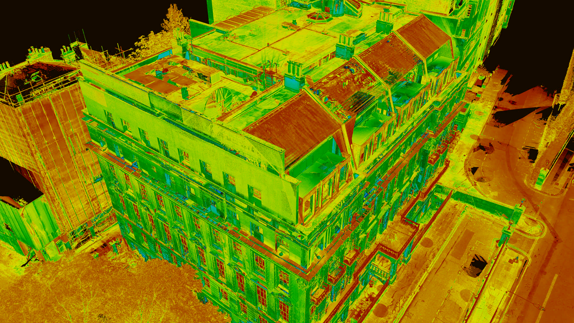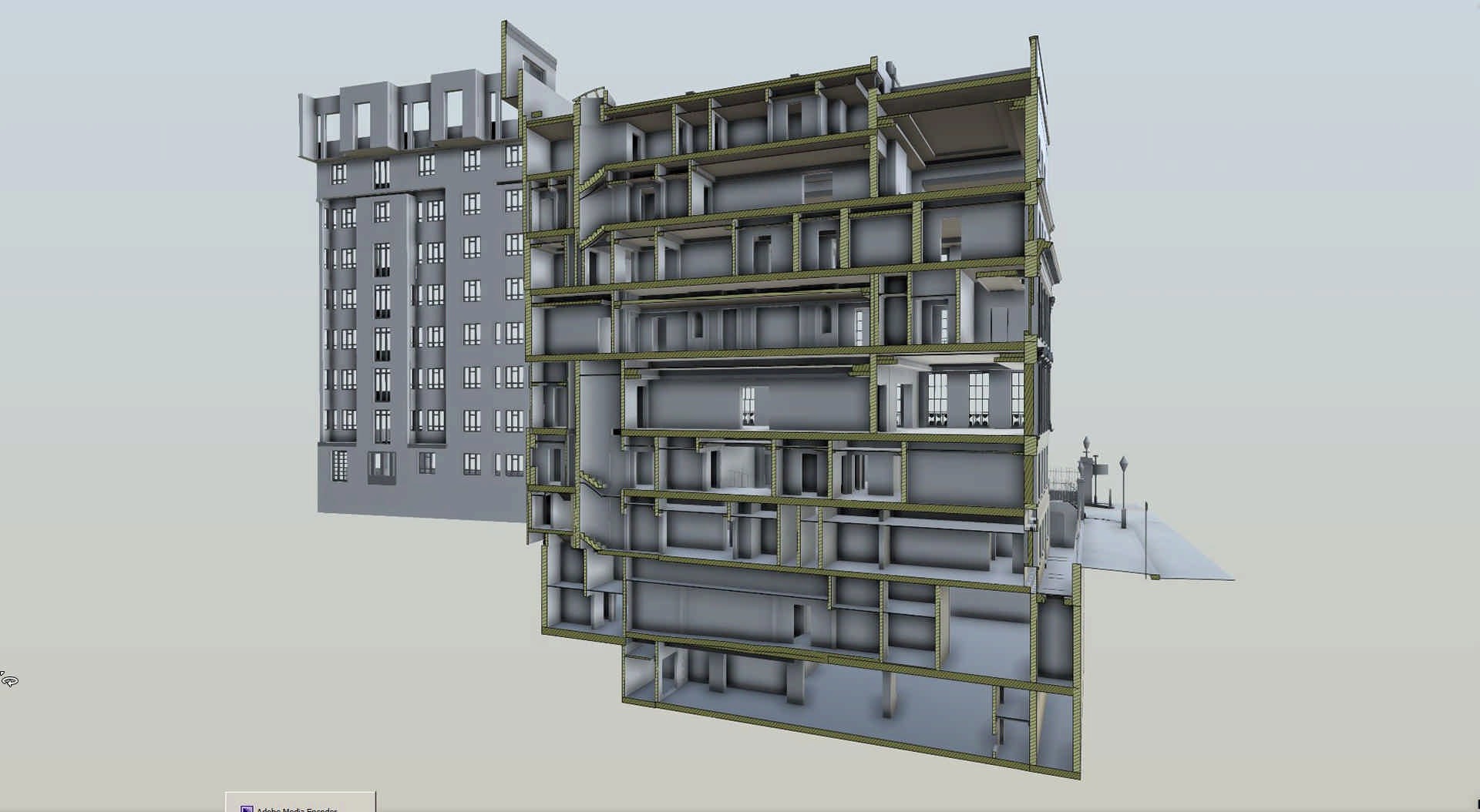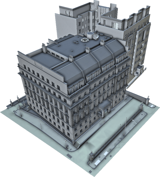 Відповідно до специфікації замовлення, за нашою участю було проведено комплексну зйомку та 750 лазерних сканувань величезного семиповерхового будинку з 45 спальнями протягом короткого періоду часу. Комбінований набір даних і 3D-хмара точок потім були використані для створення високодеталізованої BIM-моделі наявної будівлі в Revit разом із набором із 360 фотографічних зображень усього об’єкта та структури, наданих як Leica Truviews.