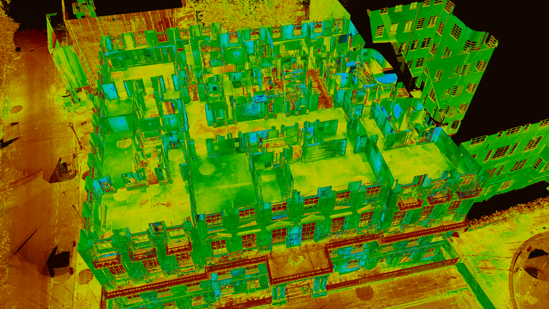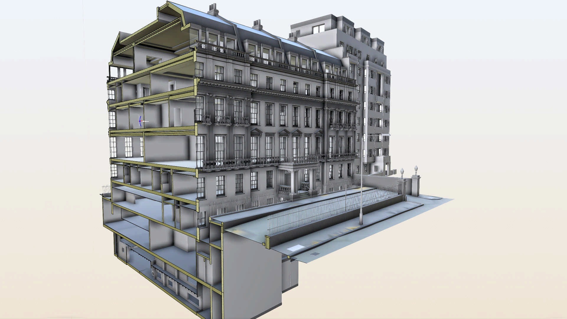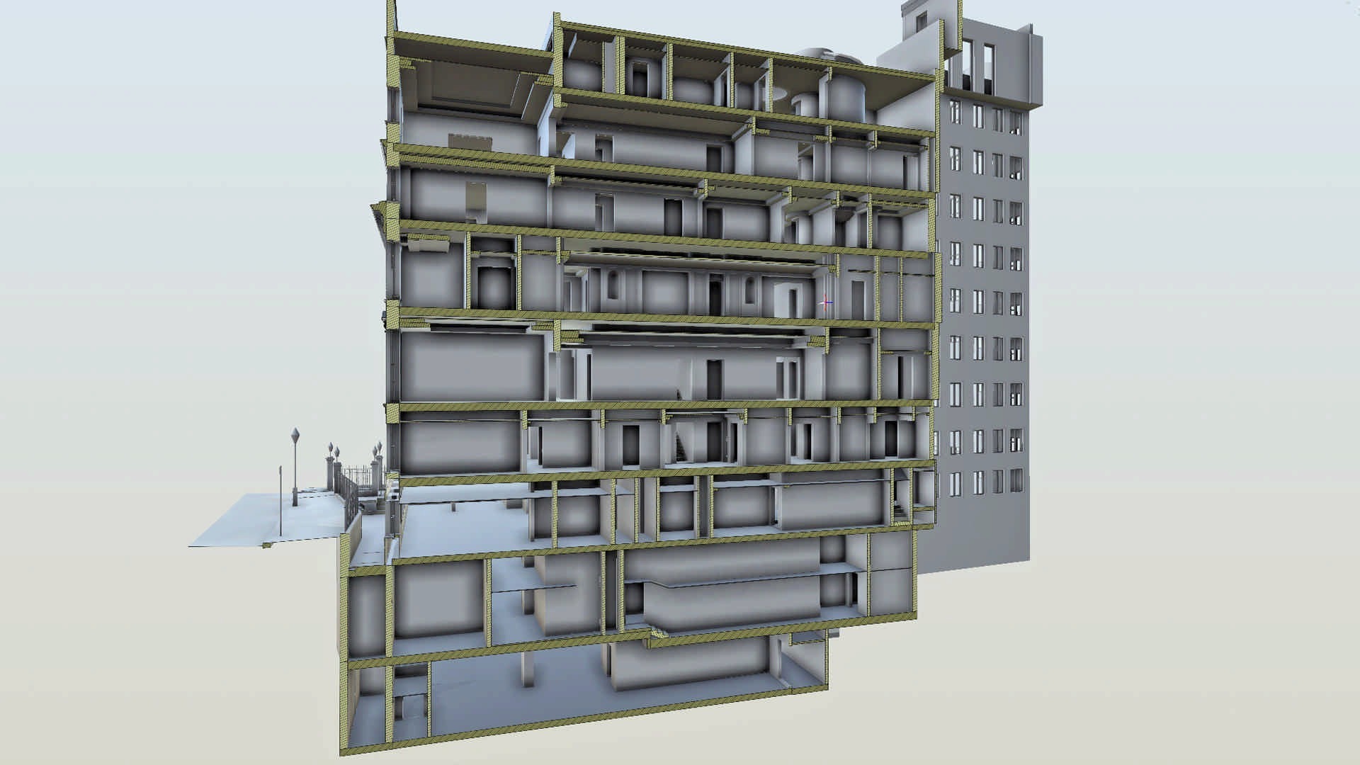 Відповідно до специфікації замовлення, за нашою участю було проведено комплексну зйомку та 750 лазерних сканувань величезного семиповерхового будинку з 45 спальнями протягом короткого періоду часу. Комбінований набір даних і 3D-хмара точок потім були використані для створення високодеталізованої BIM-моделі наявної будівлі в Revit разом із набором із 360 фотографічних зображень усього об’єкта та структури, наданих як Leica Truviews.