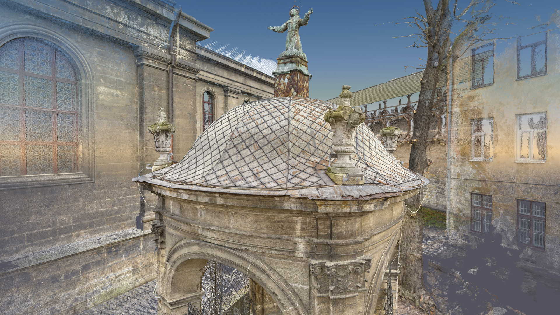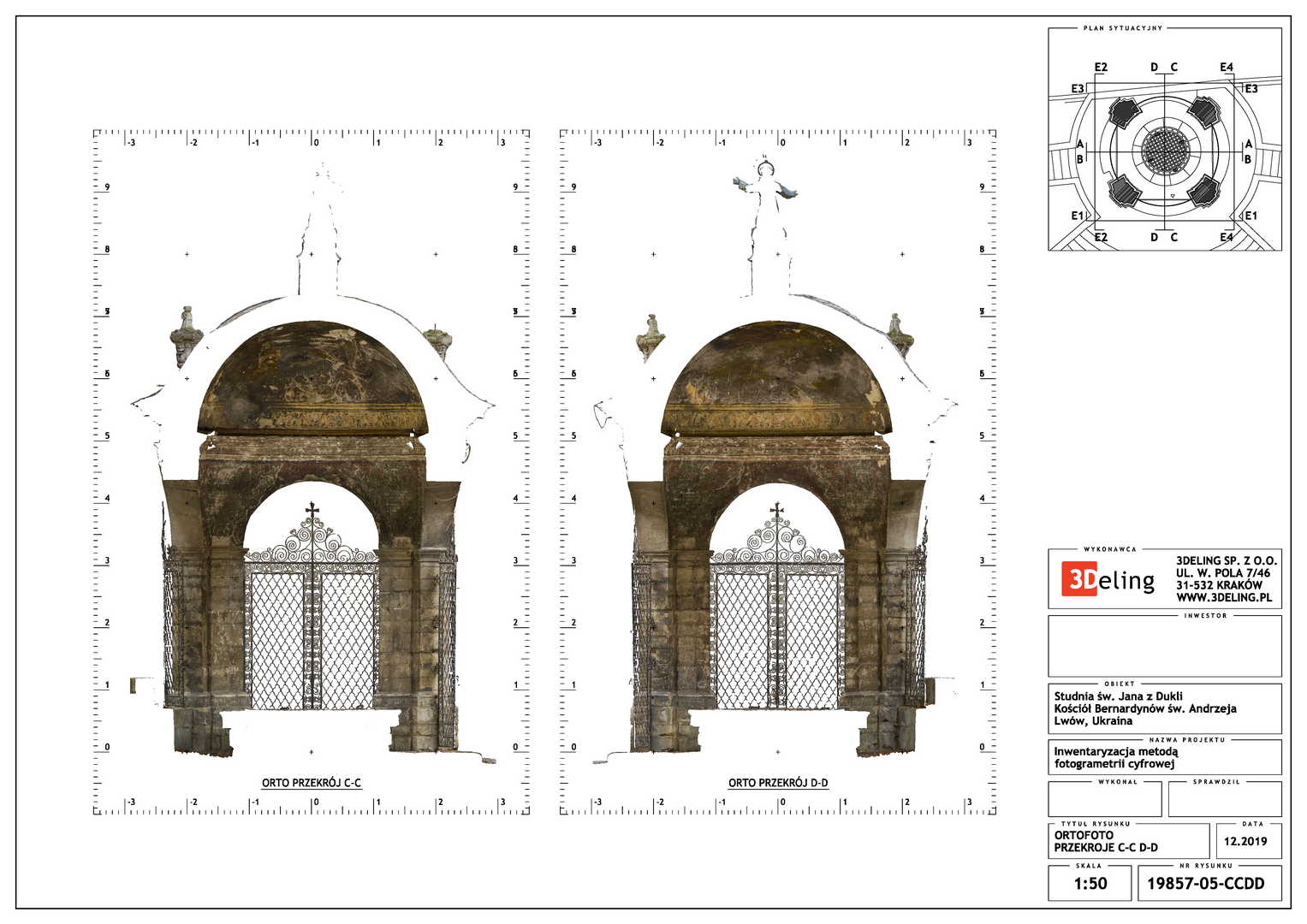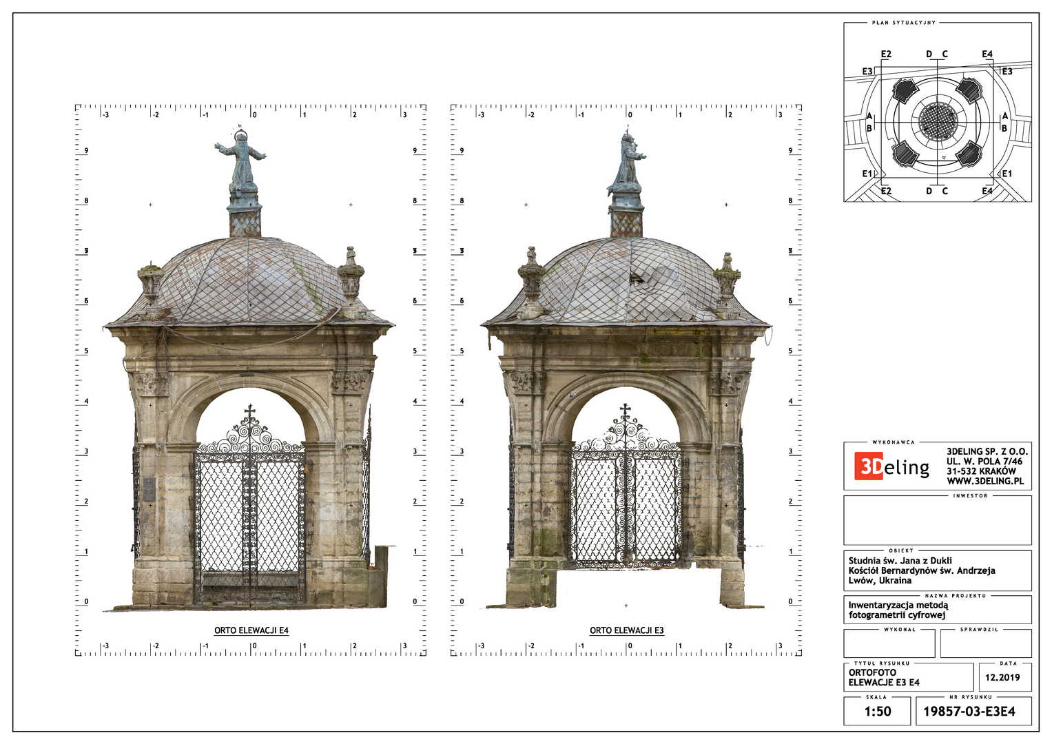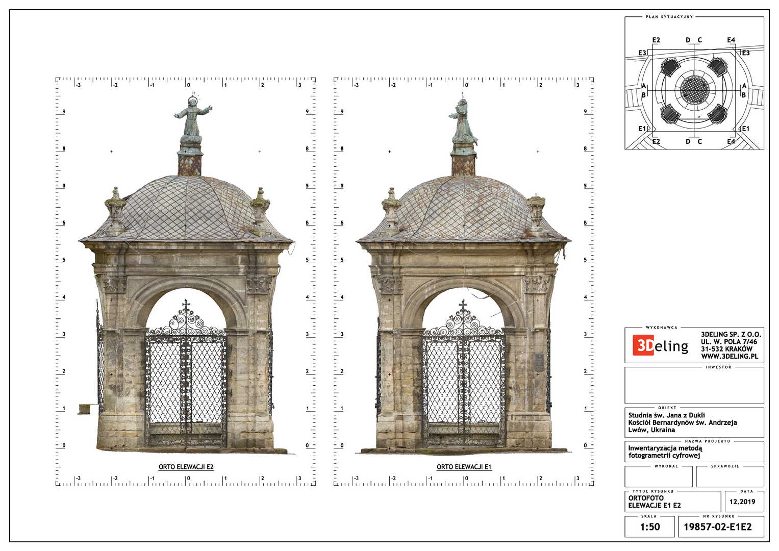На замовлення Інституту «Полоніка» оцифрування Криниці Святого Іоанна з Дуклі у місті Львові. Об’єкт цього проєкту знаходиться біля Костелу Бернардинів у Львові. Зважаючи його масштаб і геометрію ми вирішили використовувати лише фотограмметричні інструменти, тобто цифрову камеру особливо високої роздільної здатності та геодезичний тахеометр. Другий прилад служив для вимірювання контрольних точок, необхідних для встановлення геолокації та масштабування об’єкта.