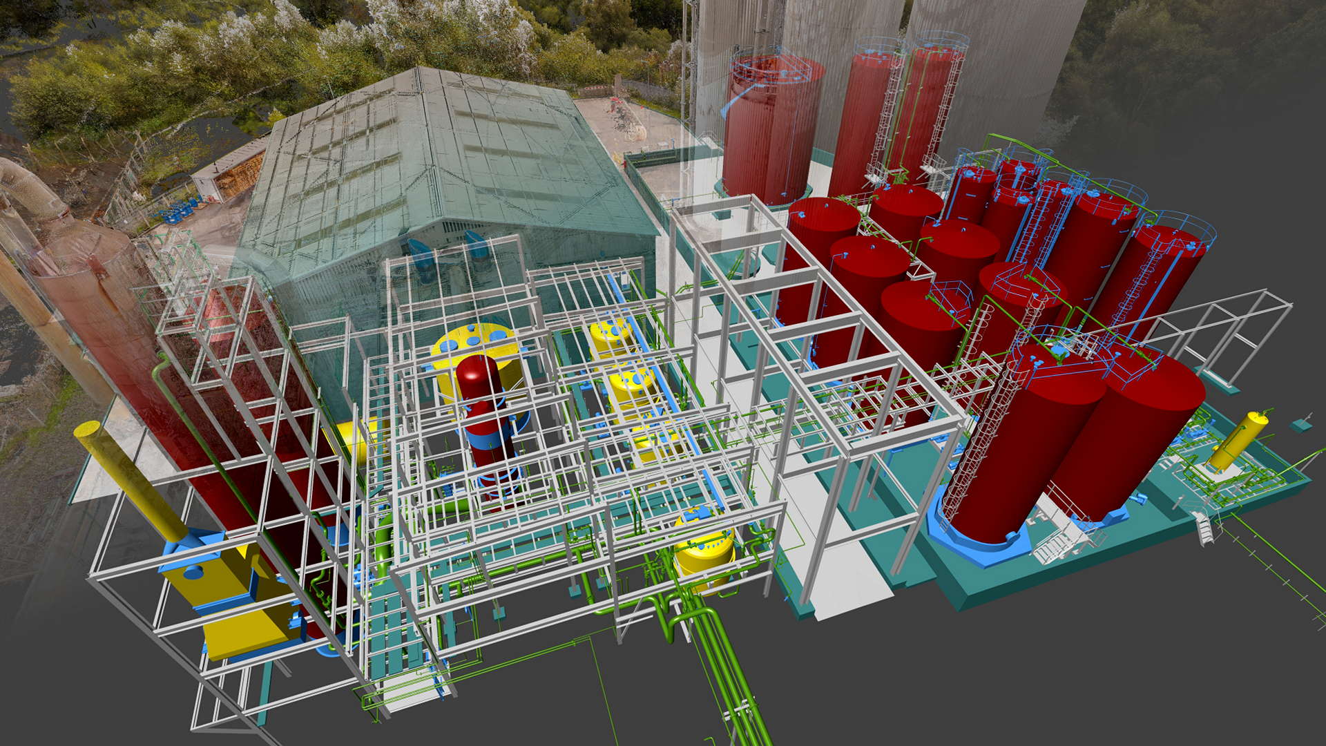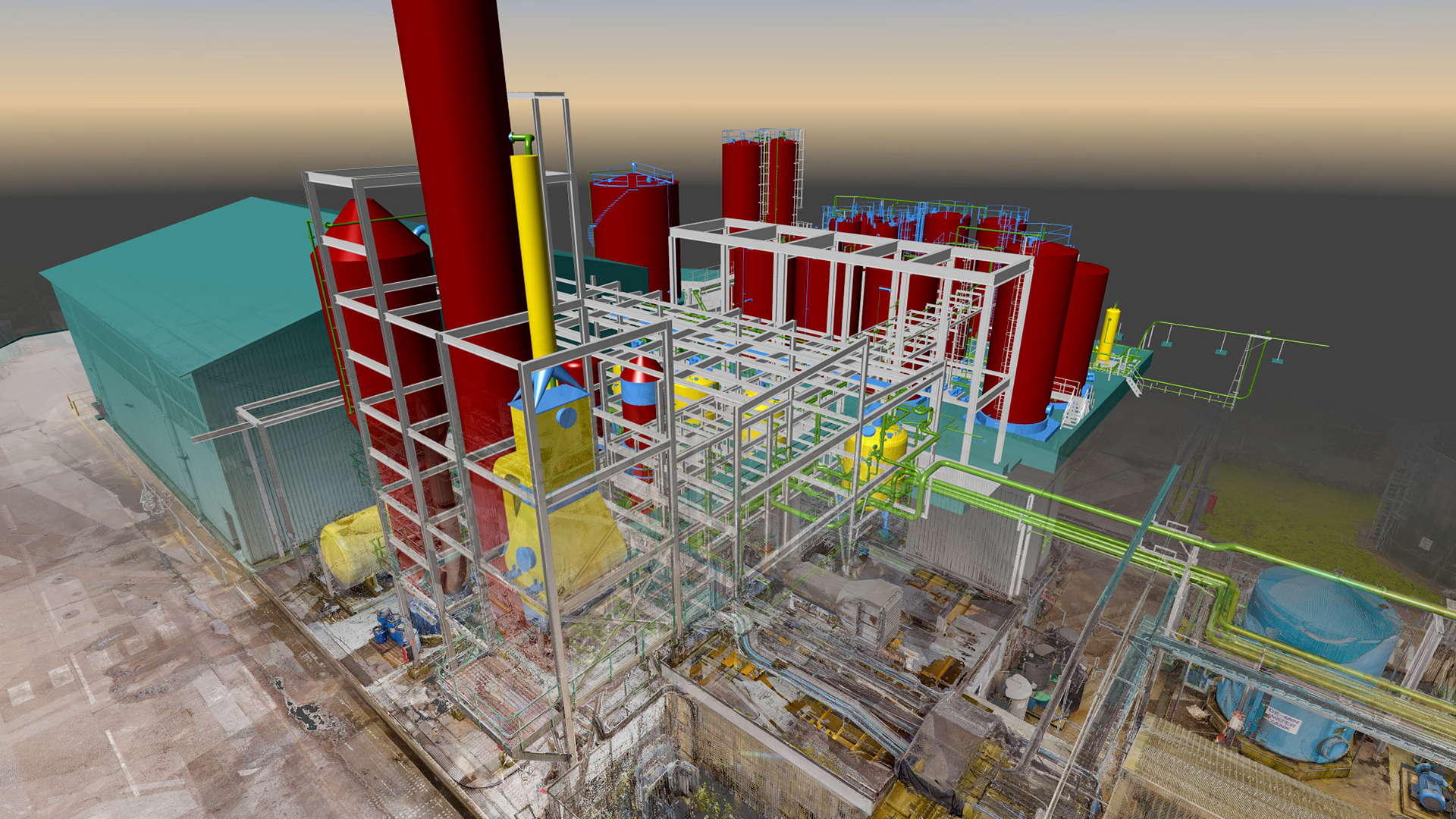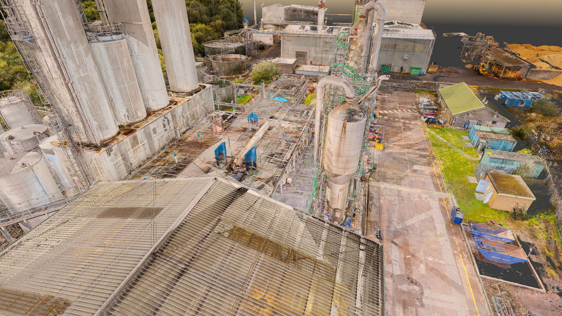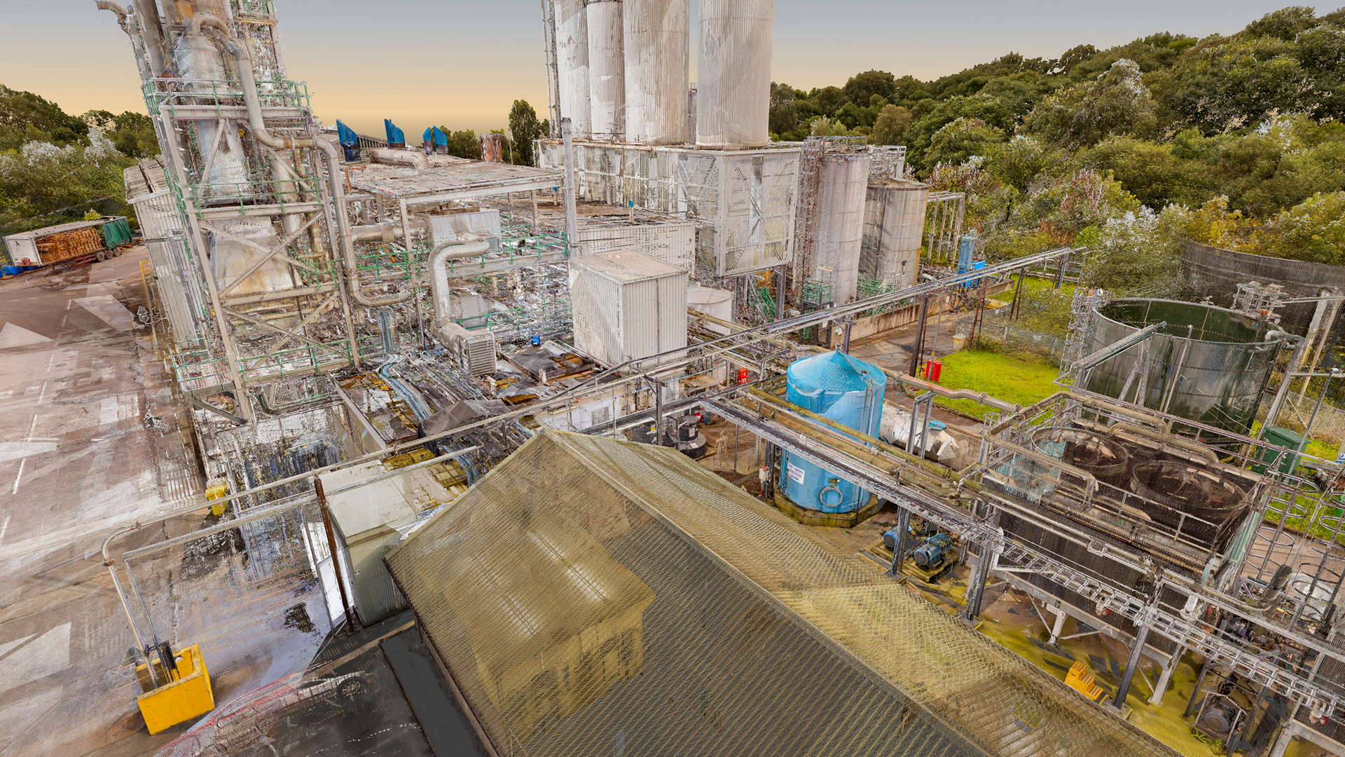 Це хімічний завод середнього розміру, розташований у Шотландії. На першому етапі проєкту ми просканували весь завод і надали клієнтові хмару точок у кольорах RGB разом із TrueView. На другому етапі ми розробили готову модель PDMS усієї території. Модель містила повну базу даних і список для трубопроводів у програмному забезпеченні AVEVA у 3D-форматі.