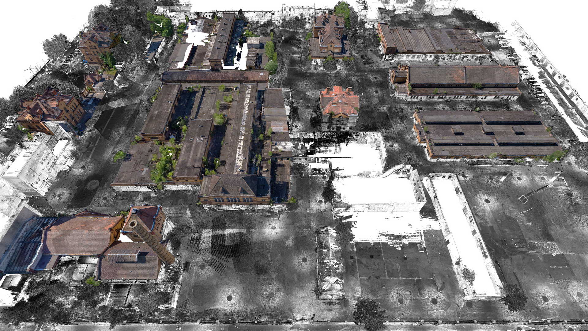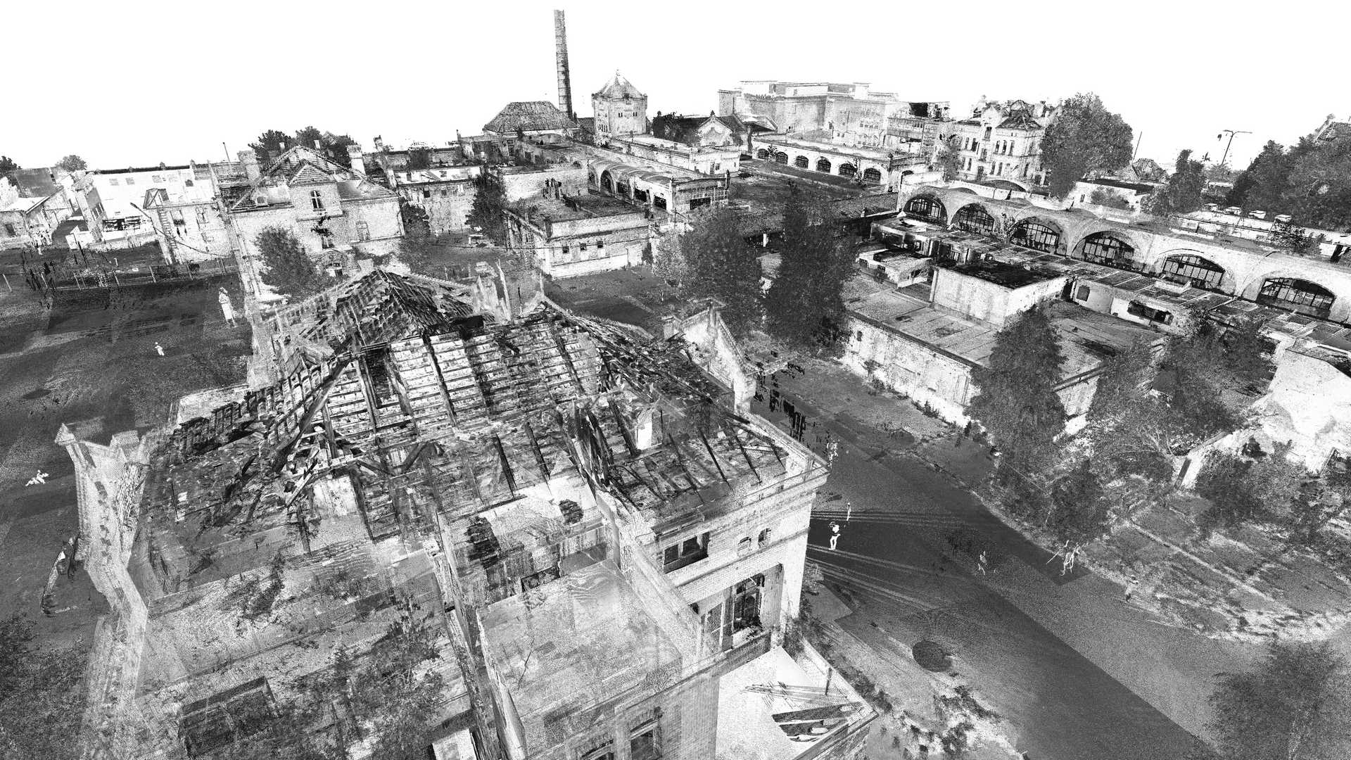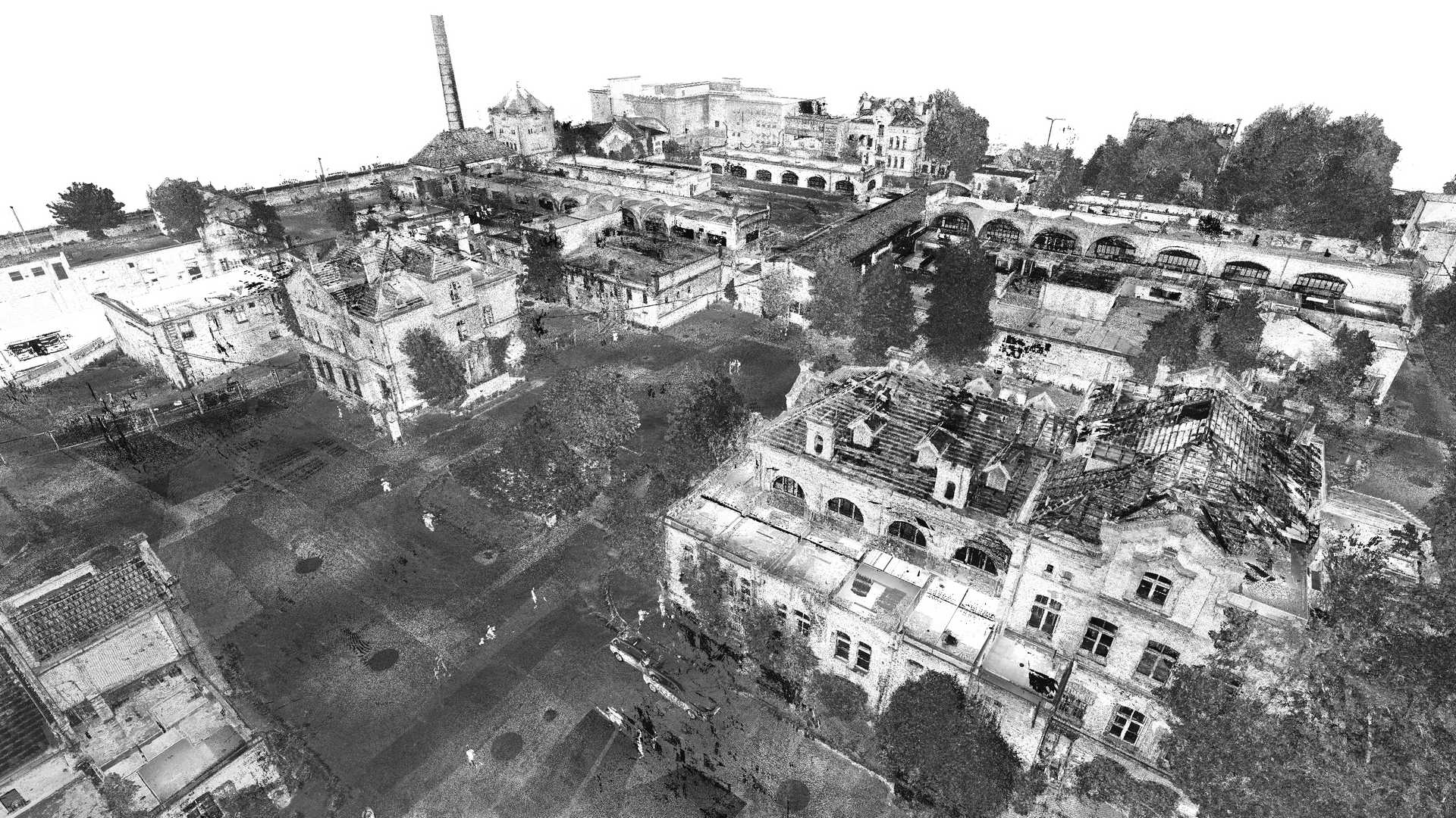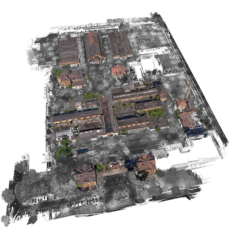 Вимірювання включали традиційну геодезичну зйомку за допомогою тахеометра та GPS, а також лазерного сканера. Дані з лазерного сканера були доповнені кольоровою хмарою точок, отриманою з безпілотника. Було вирішено використовувати якомога більше неінвазивних методів збору даних, оскільки деякі будівлі були під загрозою обвалення або доступ до них був абсолютно неможливий.