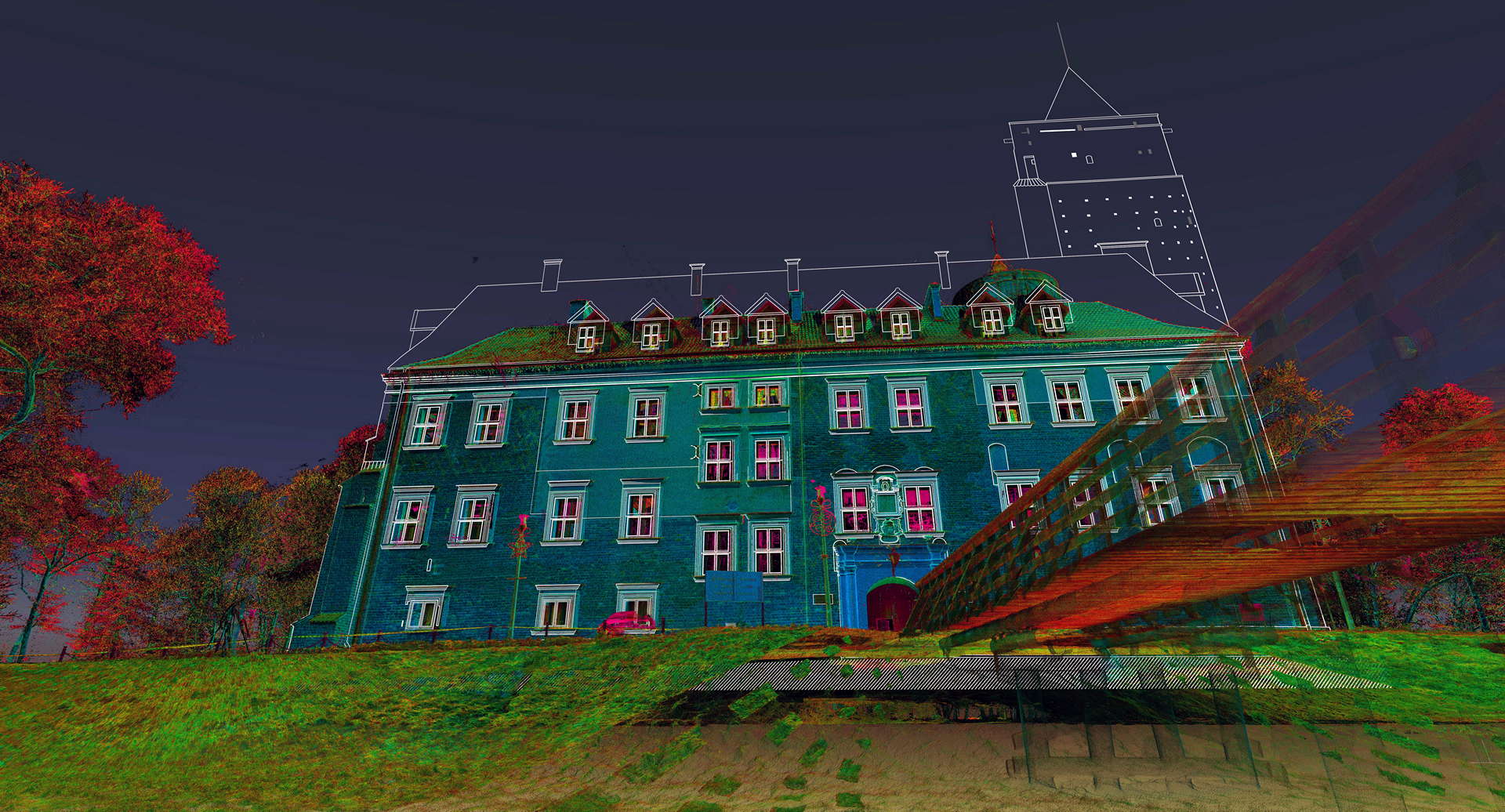 Будівлю сканували з використанням налаштувань найвищої роздільної здатності, а також фіксували дані у кольорах RGB. Об’єднана та очищена від шумів хмара кольорових точок була використана як основа для створення ортозображень (метричних зображень) усіх фасадів. Креслення у CAD були створені з того самого набору даних. Потім їх наклали на ортозображення, щоб продемонструвати весь потенціал даних лазерного сканування. Додатково до робіт із проведення сканування також була створена 3D-візуалізація об’єкта, що дозволило клієнтові використовувати дані сканування в маркетингових цілях.